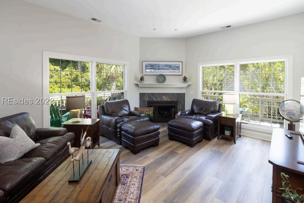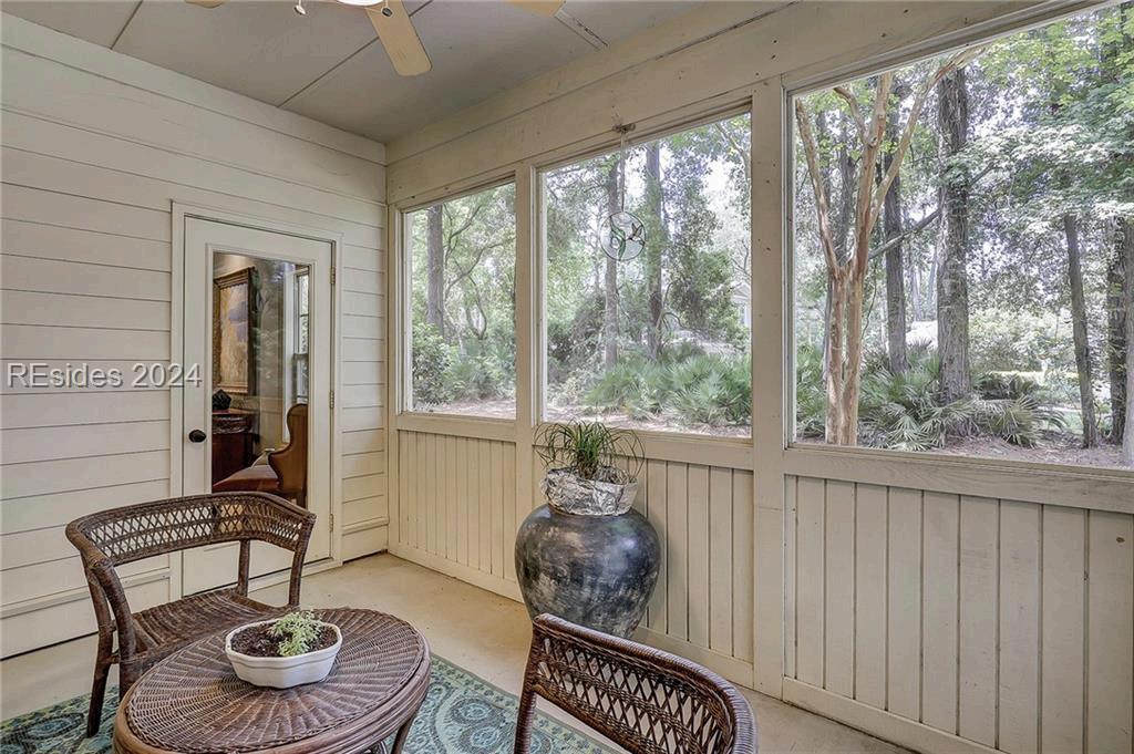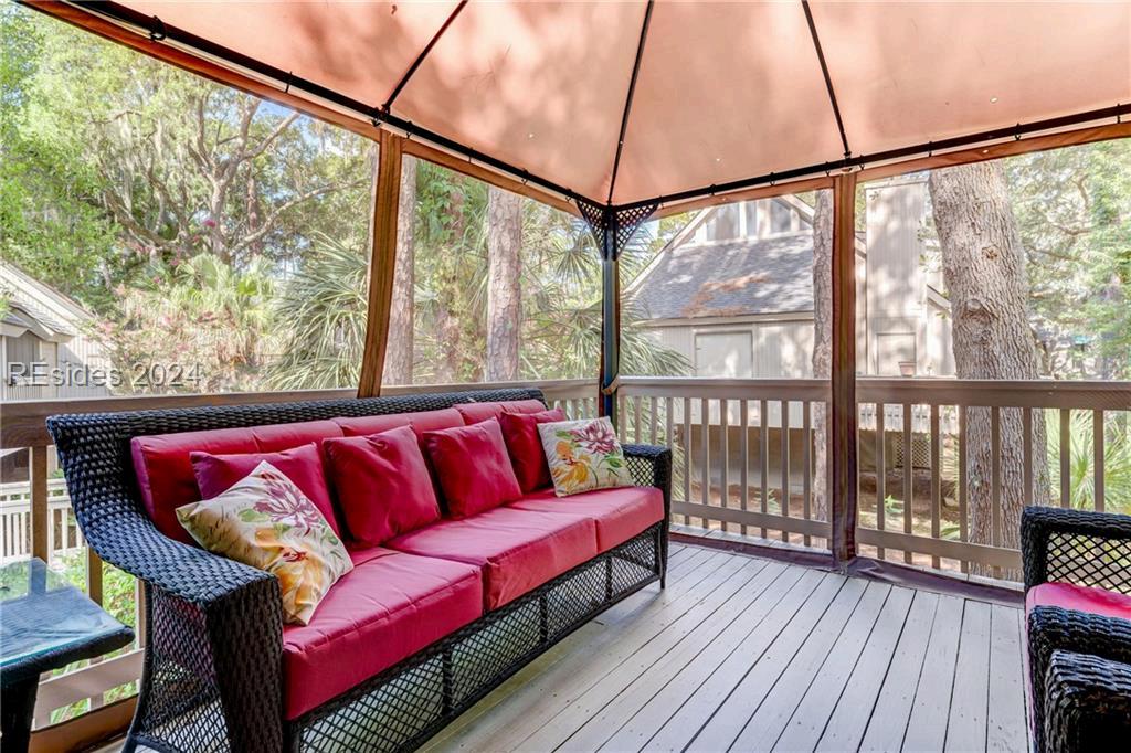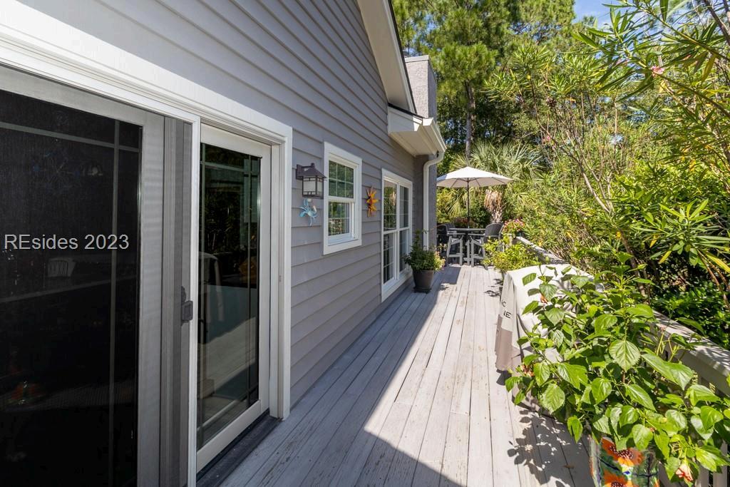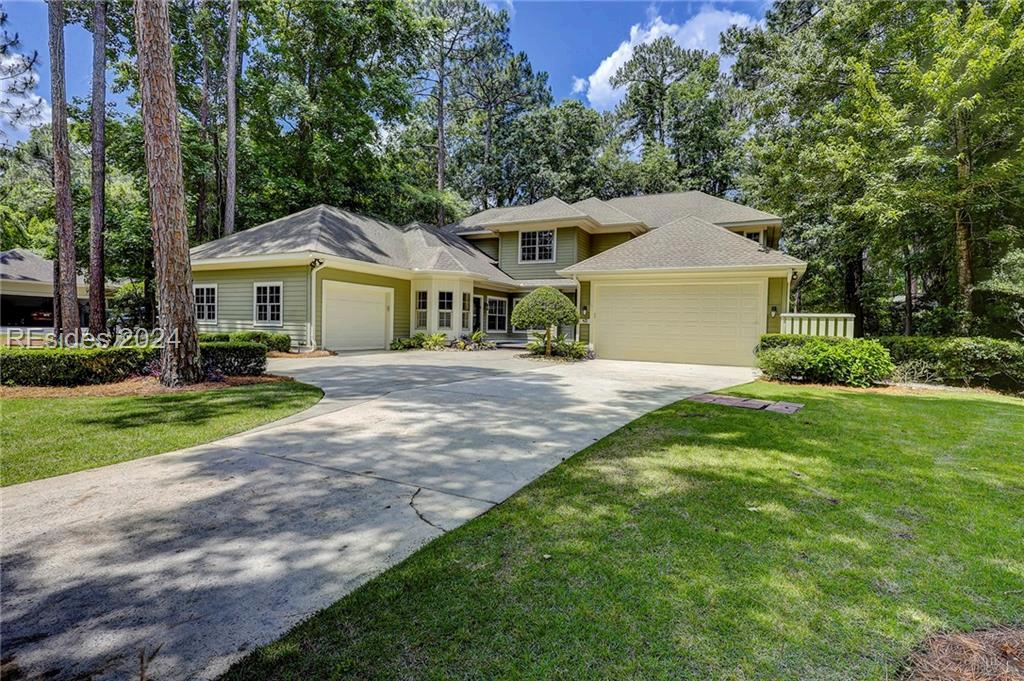 Completely Remodeled 3 BR, 3 Full BA home in Sea Pines Club Course Community. Each bedroom offers an ensuite convenience, ensuring privacy and ease. The spacious kitchen, remodeled in 2021, showcases new cabinets and Quartz countertops, centered around a 30 sq ft island with gas cooktop and counter seating The living room offers a gas fireplace & 10-foot ceilings in LR & Kitchen The Carolina Room, adorned with floor-to-ceiling windows, offers tranquil views. Outdoor living is a delight with a 540 sq ft L-shaped deck & additional 160 sq ft lower-level deck, creating the perfect setting for relaxation or entertaining. New concrete driveway. 1 4 9 O T T E R R O A D