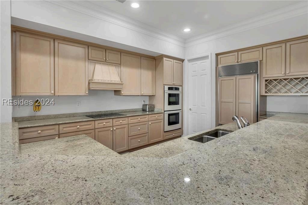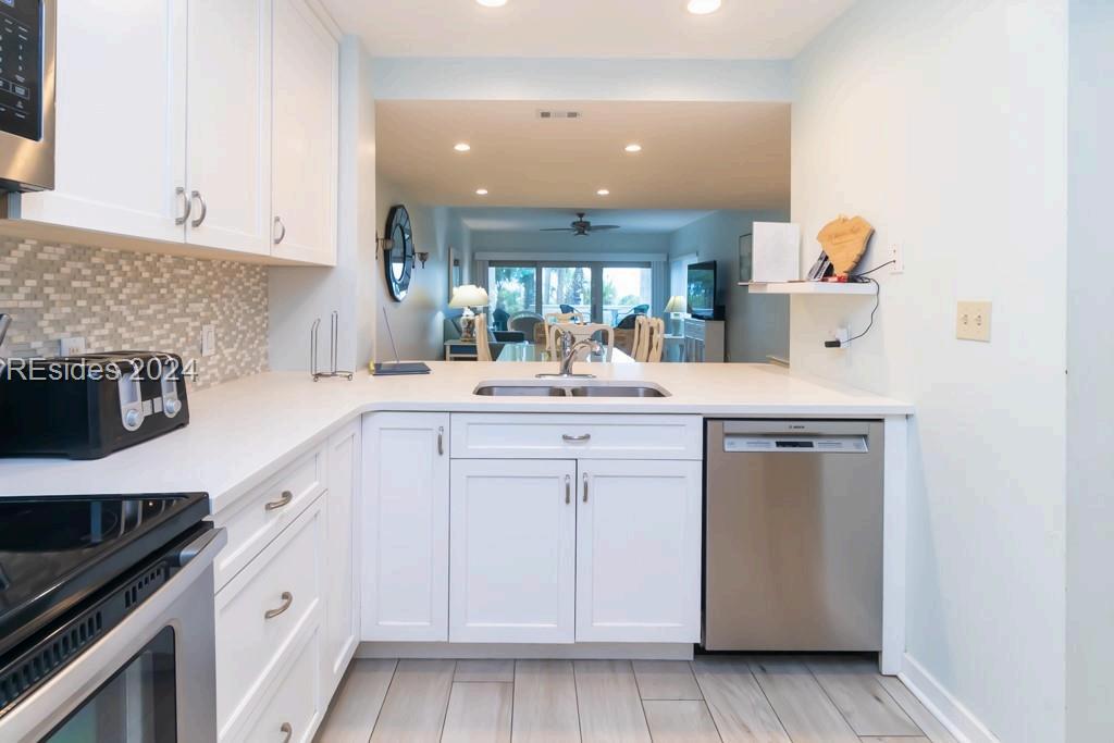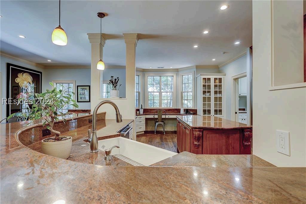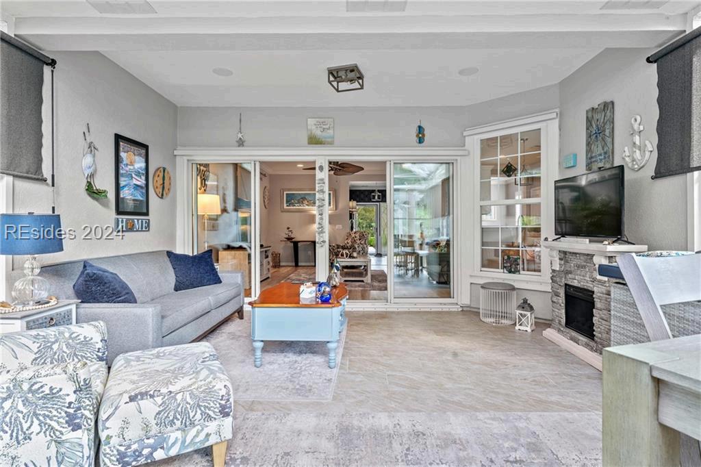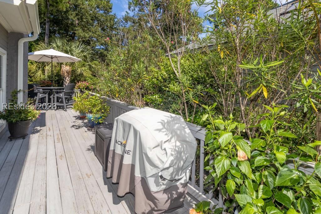 Completely Remodeled 3 BR, 3 Full BA home in Sea Pines Club Course Community. Each bedroom offers an ensuite convenience, ensuring privacy and ease. The spacious kitchen, remodeled in 2021, showcases new cabinets and Quartz countertops, centered around a 30 sq ft island with gas cooktop and counter seating The living room offers a gas fireplace & 10-foot ceilings in LR & Kitchen The Carolina Room, adorned with floor-to-ceiling windows, offers tranquil views. Outdoor living is a delight with a 540 sq ft L-shaped deck & additional 160 sq ft lower-level deck, creating the perfect setting for relaxation or entertaining. New concrete driveway. 1 4 9 O T T E R R O A D
