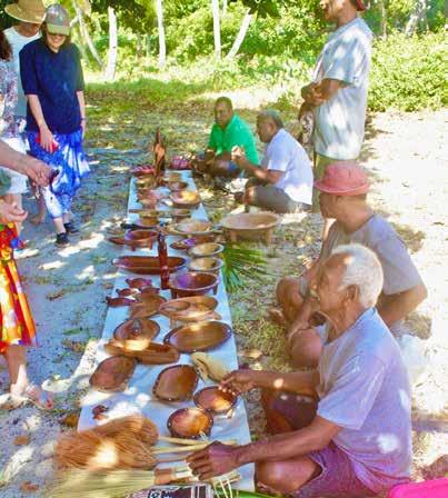 sand, crystal-clear water, and coconut palms. We chose to swim and paddleboard, while half of the passengers set off on a hike to an inland saltwater lake. Villagers had set up rudimentary stalls on the beach, showcasing their specialty craft of wood-carved bowls with shell inlay, woven baskets, and carry bags. They also offered freshly cut coconuts.
