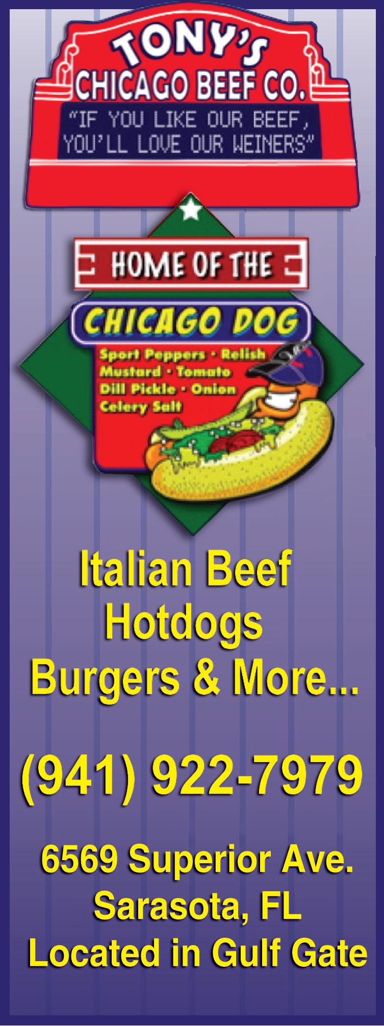 Tony’s Chicago Beef Company (S-16) is owned and operated by true Chicagoans. Dedicated to deliver Chicago’s best food, Chicago style Hot Dogs wit’ the works ... dragged through the garden on poppy seed buns with fresh cut fries, Italian Beef Sandwiches anyway you like, dipped or dry, sweet or hot.