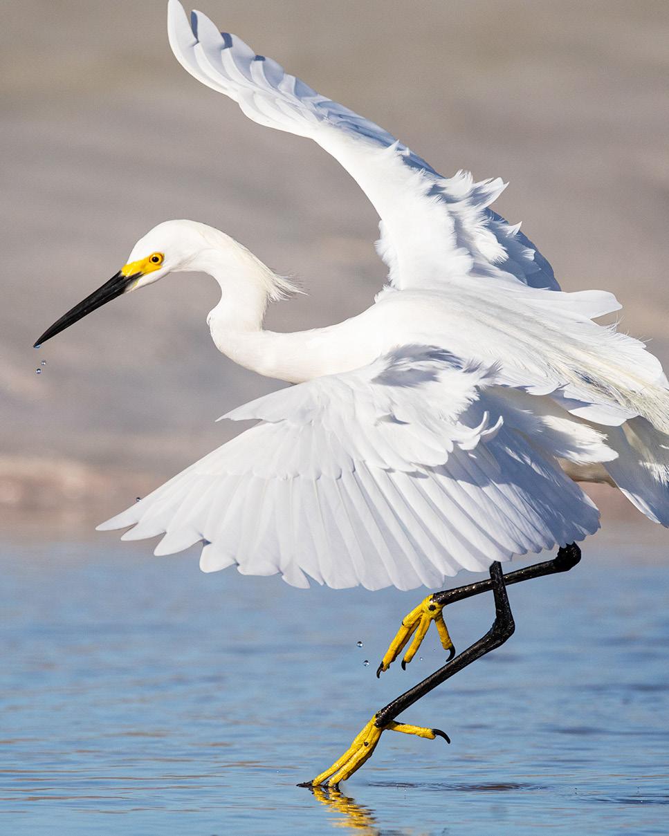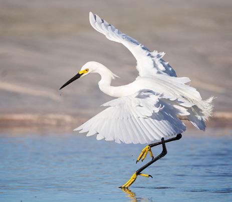 This crow-sized heron is easily identified by its brilliant yellow feet and lores — the surface on each side of a bird’s head between the eye and the beak or bill. The snowy’s stunning white plumage is set in dramatic contrast with jetblack legs and bill. Wispy plumes called aigrettes cascade down the nape of the neck like a shaggy haircut.