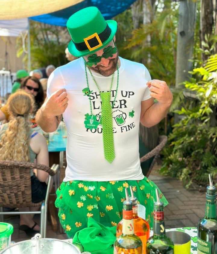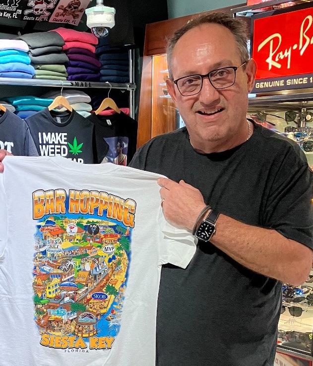 James Ritter, owner of Siesta Key Outfitters, with a fun T-shirt that illustrates what the island’s night life has to offer. (photo by Jane Bartnett)