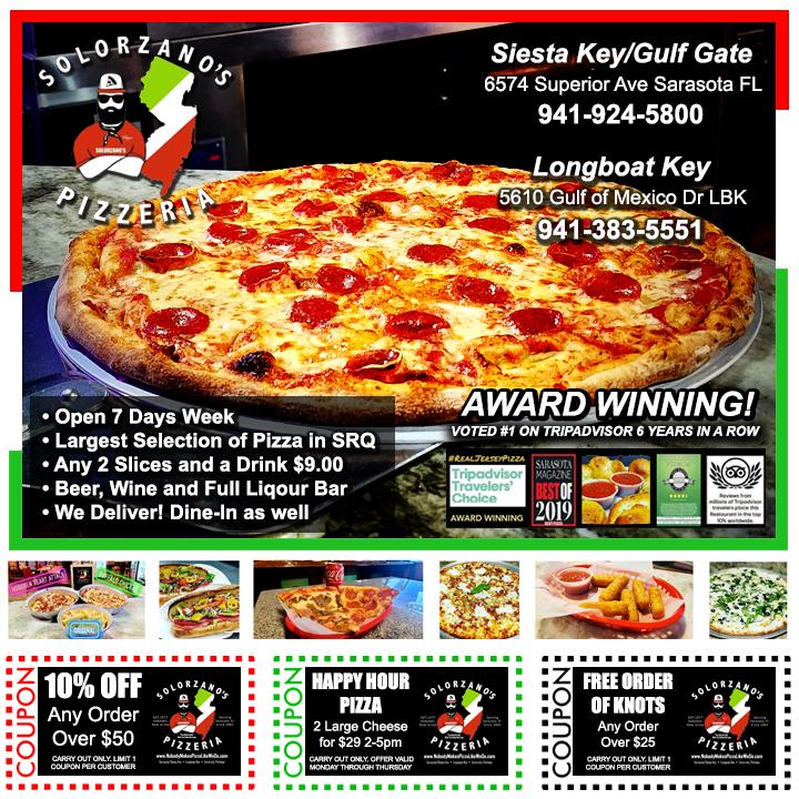 used by their Italian ancestors. Dine inside, outside, pick up, or DELIVERY anywhere on Siesta Key, or in Sarasota until 3:30 a.m. 6574 Superior Ave., 941924-5800.