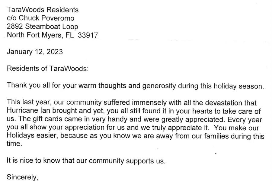 Your Homeowners Association, working together with Hometown America, has been making good progress in building back and improving after Hurricane Ian. Some issues can be and are addressed quickly, while others require more time and follow-up. Members can track the progress on our www.twhoa.net website under ‘Community Improvement’. We also thank the residents who take the time to complete and submit ‘Contact Us’ on the website with the issues, concerns, and feedback. Your input drives the meetings with the Manager. As you might know, your Homeowners Association meets monthly with the Manager with an agenda-driven meeting. In addition, the Board meets monthly throughout the year to provide continuity and continuum. The Board voted recently to conduct Homeowner Meetings each month throughout the year to keep all residents updated on issues affecting us here in Tara Woods. Resident participation is key to a strong Homeowners Association and Community. If you are volunteering, we all thank you and appreciate you. If you would like to volunteer or just find out more about it, contact me.