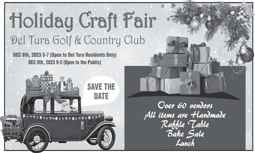 4 THE TOWER AUG / SEPT 2023 941.312.0665 www.DELTURA-HOA.com 549-7701 or Mobile 851-3102 “Dirty White Carpets Are My Specialty” “CallJackGetJack” owner/operator HUGHES CARPET CLEANING Experience My Experience “Cleaner & Dryer” Serving Lee County For Over 35 Years Specializing in Carpet and Upholstery Cleaning Business / Residential Long time cleaner for Hometown America in Del Tura Licensed Honest Insured Dependable HOLIDAY