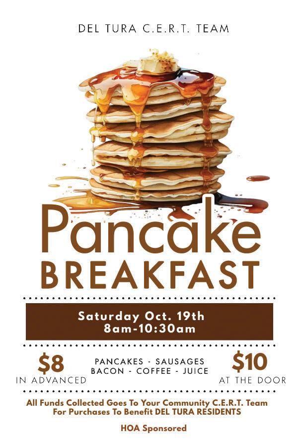CERT will be hosting a Pancake Breakfast along with the Del Tura HOA on October 19th from 8am until 10:30 am. Tickets will go on sale on October 1 st at Tuesday Coffee. Profits will go to the CERT team for future purchases of equipment to benefit the community.
