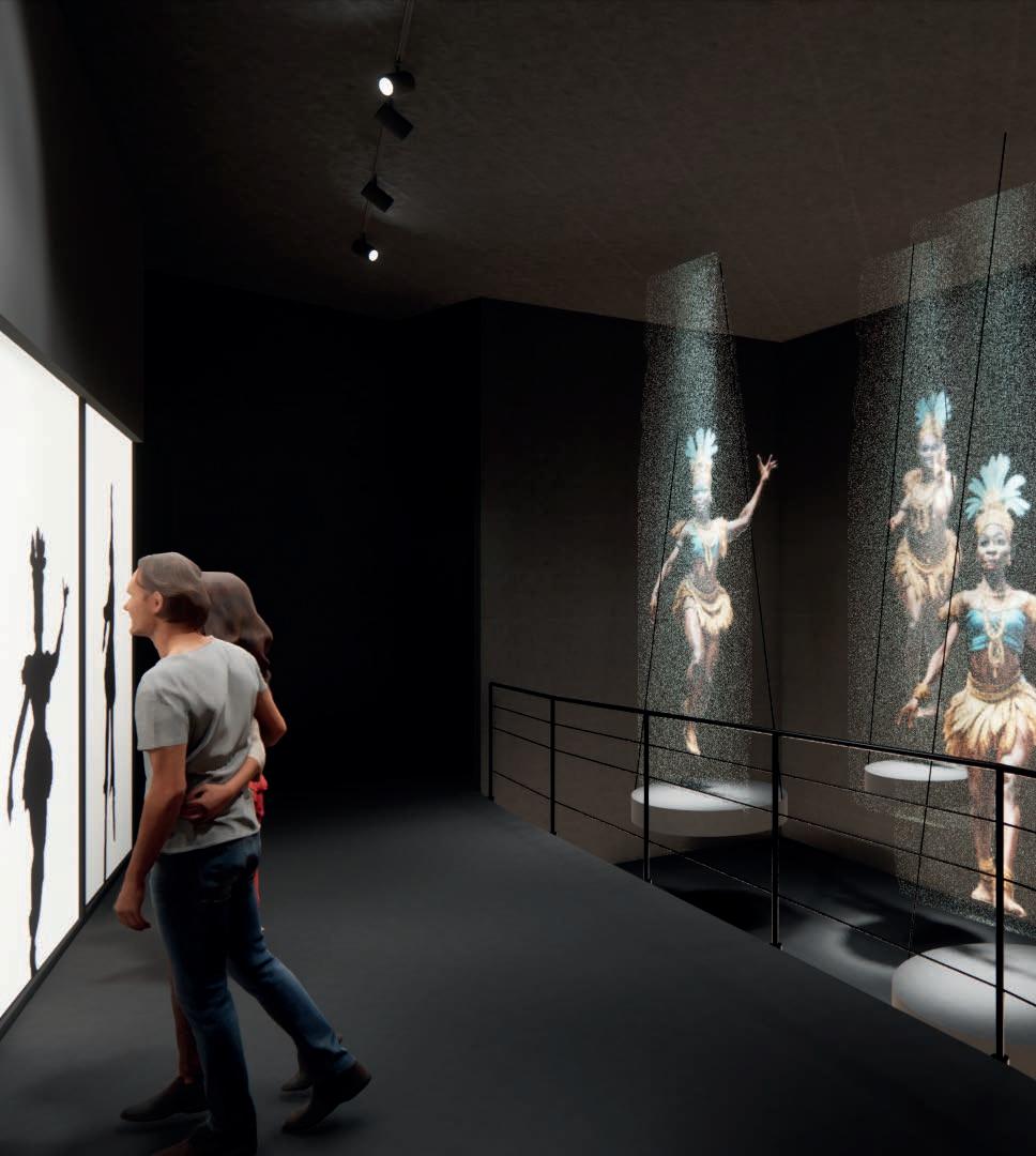 Right after entering the space, the users find holograms of traditional mask dancers on the left.