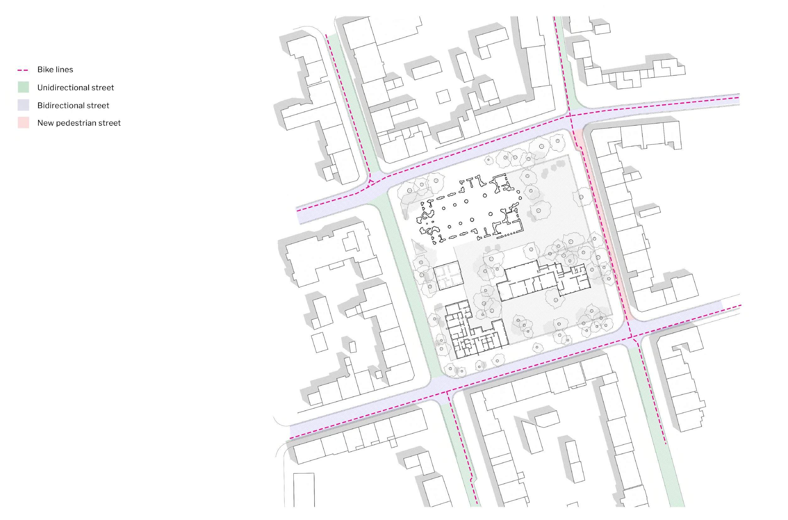 On the other hand, at an urban level, we intervene directly on the four streets that evoke this space, treating their intersections in an orderly way and establishing new bike lane and parking areas.