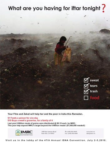 Your Fitra and Zakat will help her and the poor in India this Ramadan. $1 Feeds a person for one day $10 Buys a week’s groceries, for a family of 4 Last year 6 Million meals of grains were distributed @ $0.15 each, by IMRC. This year help expand IMRC’s target beyond the 6 Million meals! ($1,000,000 needed!) 1000 San Antonio Road Palo Alto, CA 94303