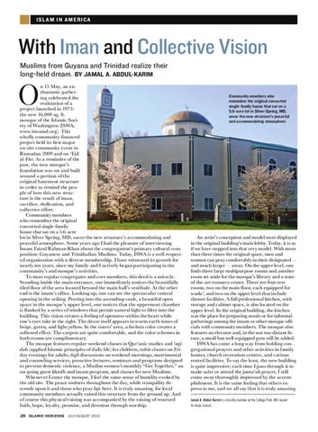 n 15 May, an enthusiastic gathering celebrated the realization of a project launched in 1973: the new 16,000 sq. ft. mosque of the Islamic Society of Washington (ISWA; www.iswamd.org). This wholly community-financed project held its first major on-site community event in Ramadan 2009 and on ‘Eid al-Fitr. As a reminder of the past, the new mosque’s foundation was set and built around a portion of the original basement structure in order to remind the people of how this new structure is the result of iman, sacrifice, dedication, and collective effort. Community members who remember the original converted single-family house that sat on a 5.6-acre lot in Silver Spring, MD, savor the new structure’s accommodating and peaceful atmosphere. Some years ago I had the pleasure of interviewing Imam Faizul Rahman Khan about the congregation’s primary cultural composition: Guyanese and Trinidadian Muslims. Today, ISWA is a well-respected organization with a diverse membership. I have witnessed its growth for nearly ten years, since my family and I actively began participating in the community’s and mosque’s activities. To most regular congregates and core members, this deed is a miracle. Standing inside the main entrance, one immediately notices the beautifully tiled floor of the area located beyond the main hall’s vestibule. At the other end is the imam’s office. Looking up, one can see the spectacular central opening in the ceiling. Peering into the ascending vault, a beautiful open space in the mosque’s upper level, one notices that the uppermost chamber is flanked by a series of windows that permit natural light to filter into the building. This vision creates a feeling of openness within the heart while one’s eyes take in the sight. The décor itself appears in warm earth tones of beige, green, and light yellow. In the sisters’ area, a fuchsia color creates a softened effect. The carpets are quite comfortable, and the color schemes in both rooms are complimentary. The mosque features regular weekend classes in Qur’anic studies and ‘aqidah (applied Islamic principles of daily life) for children, tafsir classes on Friday evenings for adults, fiqh discussions on weekend mornings, matrimonial and counseling services, proactive lectures, seminars and programs designed to prevent domestic violence, a Muslim women’s monthly “Get Together,” an on-going guest khatib and imam program, and classes for new Muslims. Whenever I enter the mosque, I feel the same sense of humility evoked by the old site. The peace endures throughout the day, while tranquility descends upon it and those who pray fajr here. It is truly amazing, for local community members actually raised this structure from the ground up. And of course this physical raising was accompanied by the raising of renewed faith, hope, loyalty, promise, and devotion through worship. 28 ISLAMIC HORIZONS JULY/AUGUST 2010