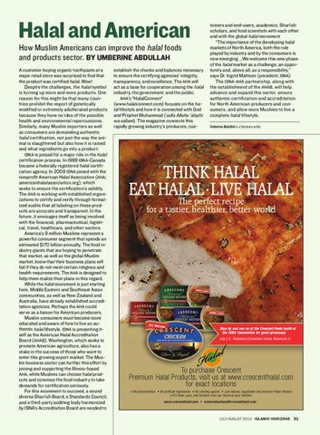 Halal and American How Muslim Americans can improve the halal foods and products sector. BY UMBERINE ABDULLAH A customer buying organic toothpaste at a major retail store was surprised to find that the product was certified halal. Wow! Despite the challenges, the halal symbol is turning up more and more products. One reason for this might be that many countries prohibit the import of genetically modified or extremely adulterated products because they have no idea of the possible health and environmental repercussions. Similarly, many Muslim importers as well as consumers are demanding authentic halal certification, not just the way the animal is slaughtered but also how it is raised and what ingredients go into a product. ISNA is poised for a major role in the halal certification process. In 1988 ISNA-Canada became a federally registered halal certification agency. In 2009 ISNA joined with the nonprofit American Halal Association (AHA; americanhalalassociation.org), which seeks to ensure the certification’s validity. The AHA is working with established organizations to certify and verify through formalized audits that all labeling on these products are accurate and transparent. In the future, it envisages itself as being involved with the financial, pharmaceutical, logistical, travel, healthcare, and other sectors. America’s 9 million Muslims represent a powerful consumer segment that spends an estimated $170 billion annually. The food industry giants that are hoping to penetrate that market, as well as the global Muslim market, know that their business plans will fail if they do not meet certain religious and health requirements. The AHA is designed to help them realize their plans in this regard. While the halal movement is just starting here, Middle Eastern and Southeast Asian communities, as well as New Zealand and Australia, have already established accreditation agencies. Perhaps the AHA could serve as a liaison for American producers. Muslim consumers must become more educated and aware of how to live an authentic halal lifestyle. ISNA is presenting itself as the American Halal Accreditation Board (AHAB). Washington, which seeks to promote American agriculture, also has a stake in the success of those who want to enter this growing export market. The Muslim business sector can further this effort by joining and supporting the Illinois-based AHA, while Muslims can choose halal products and convince the food industry to take demands for certification seriously. For this movement to succeed, a sound diverse Shari‘ah Board, a Standards Council, and a third-party auditing body harmonized by ISNA’s Accreditation Board are needed to