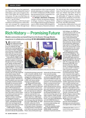 faith dialogue, the CIOGC became synonymous with civic life by embracing immigration reform and joining various coaliMuslim communities are benefitting from the Greater Chicago Muslim tions. It also witnessed the largest expansion in its budget, experience in collaborative working. BY DR. MOHAMMED ZAHER SAHLOUL members, and staff. Gov. Howard any people consider Dean (chairman, Democratic Natheir eighteenth birthday tional Committee) addressed a to be a landmark. And large audience of Chicago Musyet as we celebrate the eighlims at the council chair’s invitateenth year of working together at tion and praised its role in advothe Council of Islamic Organizacating political empowerment. tions of Greater Chicago (CIOGC; In 2009, attorney Junaid www.ciogc.org), we have many Afeef led 450 Muslims to the other and more important landfirst Muslim ACTION! Day. This marks to highlight and celebrate. year more than 1,000 Muslims, In the summer of 1989, I arrived including 650 high school stufrom Syria to pursue advanced dents, participated in the second training in medicine. In my mind Muslim ACTION! Day in SpringChicago was the city of Al Capone, field. The icing on the cake was crime, gangs, and skyscrapers. Resolution SJR 0785, introBut I soon discovered an ever-welduced by State Sen. Mattie coming neighbor: one of the city’s Hunter, to designate Ramadan oldest mosques—in fact, its Mothas a “green month” in Illinois in CIOGC component organizations meet every two months er Mosque—the Muslim Commu- SHURA: order to promote awareness _______________________________________________________________________ nity Center. During my first few among faith communities about months in the city I also visited the of uniting this growing community along with the Chicago archdio- environmental issues. Those under a common umbrella. An ad cese, and other groups. area’s oldest mosque, Northearly visionaries who sought to hoc committee was formed to inbrook’s Islamic Cultural Center, In the aftermath of 9/11, attor- set up a basic coordinating orgavestigate this ambitious project. home to the Bosnian community; ney Kareem Irfan (2001-2004), nization could not have fathits largest mosque, Villa Park’s Is- The CIOGC was officially formed who led the CIOGC through one omed a day when “their council’ lamic Foundation; and a few small- in 1992, with twenty member of the community’s most crucial would comprise more than sixty mosques and organizations. er mosques near Devon Avenue. moments, was assisted by Amina member organizations and many Dr. Mohammed Kaiseruddin Although the community looked Saeed, a young outreach direcmore would be waiting to join. (1993-1996), a nuclear engineer tor. Council leaders met with vibrant, diverse, and entrepreThey probably did not dream of a with a great passion for Islam and public officials and law enforce- day when it would take 1,000 neurial, it had no central leadercommunity service, led the coun- ment representatives, and mem- Muslims to Springfield to advoship or official spokesperson. Everyone was working without co- cil in its formative period. Around bers were invited to meet with cate for the common good, serve the same time the war in Bosnia ordination, networking, or planFBI and DHS representatives at as a role model for other regional ning. Thus when a crisis hit, televi- broke out. The Chicago Muslim the Chicago Roundtable to adcouncils, coordinate care for response represented a true sion stations and news reporters dress the mounting cases of civil Muslim refugees, empower Musdemonstration of unity, and the would scramble to find any rights violations. Under the lead- lim youths and women, train Bosnia Task Force, USA helped “Moslem or Arab or something” ership of the council and United leaders, and present a positive create national awareness about Power, more than 2,000 Muslims Muslim face to the media. who happened to be near a mosque. They would then ask that this holocaust. Over the following met with 2,000 Christians to The CIOGC has come a long four years (1997-2000), Dr. Talal demonstrate their commitment “expert” what Muslims thought way and, with the Almighty’s Sunbulli, a physician, led the about what was happening. Of to mutual understanding, and blessings and continued commucourse the victim spoke, and most council with humility and sinceri- good neighborliness. nity support, faces a bright future. _______________________ ty. During his tenure, it became a of the time it was not pretty. Under the relentless leaderDr. Mohammed Zaher Sahloul, a pediatrician, is founding member of United Pow- ship of Abdul Malik Mujahid In 1990, Muslim visionaries president of the Mosque Foundation, Bridgeview, IL, er for Action and Justice (United (2005-2008), a seasoned from across the greater Chicago and chairperson of the CIOGC. area met to discuss the possibility Power; www.united-power.org), champion of activism and inter-