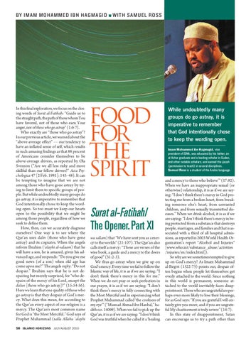 In this final exploration, we focus on the closing words of Surat al-Fatihah: “Guide us to thestraightpath,thepathofthosewhomYou have favored, not of those who earn Your anger, nor of those who go astray” (1:6-7). Who exactly are “those who go astray”? In our previous article, we warned about the “above-average effect” — our tendency to have an inflated sense of self, which results in such amusing findings as that 88 percent of Americans consider themselves to be above-average drivers, as reported by Ola Svenson (“Are we all less risky and more skillful than our fellow drivers?” Acta Psychologica 47 [2 Feb. 1981]: 143–48). It can be tempting to imagine that we are not among those who have gone astray by trying to limit them to specific groups of people. But while undoubtedly many groups do go astray, it is imperative to remember that God intentionally chose to keep the wording open. So too must we keep our hearts open to the possibility that we might be among those people, regardless of how we seek to define them. How, then, can we accurately diagnose ourselves? One way is to see where the Qur’an uses dalin (those who have gone astray) and its cognates. When the angels inform Ibrahim (‘alayhi al-salaam) that he will have a son, he is amazed, given his advanced age, and responds: “Do you give me good news (of a son) when old age has come upon me?” The angels reply: “Do not despair.” Ibrahim says that he is not despairing but merely surprised, for “who despairs of the mercy of his Lord, except the dalun [those who go astray]?” (15:54-56). Here we learn that one quality of those who go astray is that they despair of God’s mercy. What does this mean, for according to the Qur’an every aspect of our religion is a mercy. The Qur’an’s most common name for God is “the Most Merciful.” God says of Prophet Muhammad (salla Allahu ‘alayhi 58 ISLAMIC HORIZONS JULY/AUGUST 2010