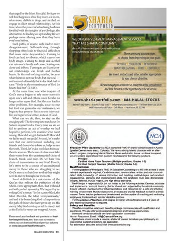 that urged by the Most Merciful. Perhaps we will find happiness if we buy more, eat more, relax more, dabble in drugs and alcohol, or engage in illicit sexual relationships. At this time, when the power of advertising has been fortified with the insights of psychology, the alternatives to leading an upstanding life are perhaps more alluring now than they have ever been before. Such paths, of course, only lead to more disappointment. Self-medicating through shopping often leads to financial difficulties that cause more despondency. Turning to food can lead to obesity, which causes low body image. Turning to drugs and alcohol can ruin one’s family and career, leaving one alone and jobless. Turning to un-Islamic sexual relationships can break and harden hearts. In the end nothing satisfies, because what thirsts is not our body, but our soul — and our soul ultimately thirsts for God. As He says: “Verily in the remembrance of God do hearts find rest” (13:28). At the same time, one who despairs of God’s mercy begins to rely more intensely upon one’s self and others, since he/she no longer relies upon God. But this can lead to other problems. For example, since no one but God can guarantee our sustenance, we begin to fear poverty. Since no one is invincible, we begin to fear others instead of God. What can we do, then, to stay on the straight path? The first step is to watch out for Satan’s myriad tricks. Every time we sin or fail to perform an act of worship we had hoped to perform, let’s examine what went wrong. How did we get distracted? How did we fail to reach our goals? Second, let’s make sure that our environment, including our friends and those who advise us, helps us see the truth. Third, let’s take our Islam from authentic sources. The leaves of a tree must take their water from the uninterrupted chain of branch, trunk, and root. Do we have this chain of transmission in our lives? Fourth, let’s strive to be a source of unconditional mercy to those who are struggling to see God’s mercy in their lives so that they might see His mercy through our own acts. Surat al-Fatihah is a microcosm of the Qur’an that reflects the perfection of the whole. How appropriate, then, that it should end with perfect symmetry. We begin it by invoking God’s mercy, “In the name of God, the Most Merciful, the Most Compassionate,” and end it by beseeching God to keep us from the path of those who have given up on His mercy. May God envelop us in His mercy, just as the Fatihah’s verses are wrapped. Ameen. Please send your feedback and questions to: foodforthespirit@isna.net. Visit us at our website, where you can download this and previous columns at: www.isna.net/foodforthespirit. ISLAMIC HORIZONS 59