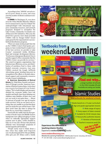 According to her, “MWRC served a total of 15,000 clients in 2009, and every year the number of clients continues to increase.” ^ UMMA: In Waukegan, IL, ever since 2004 the Urban Muslim Minority Alliance (www.ummacenters.org) has helped the underprivileged with educational support, community resources, and outreach programs designed to strengthen the Lake County community. It remains one of that area’s few initiatives. This year, the Jewel-Osco grocery store chain awarded UMMA with its Hunger Relief Award and a grant for the organization’s successful food distribution program. “There are many needy people that rely on the UMMA Center’s food pantry program; we have worked hard to make it one of the best services we provide to Lake County,” commented Arshia Ali-Khan, fund and strategic development director. “It is because of programs like Jewel-Osco’s and the support of the community that the UMMA Center can provide its services.” The award recognizes organizations that help increase efficiency, access, and distribution of nutritious food to those with limited economic resources. Last year, UMMA received the Google AdWords Advertising grant (totaling $120,000) in recognition of its efforts to furnish educational support and community resources to Lake County’s inhabitants. ^ American Association of Retired Asians: Dr. Talat Khan, founder and presi-