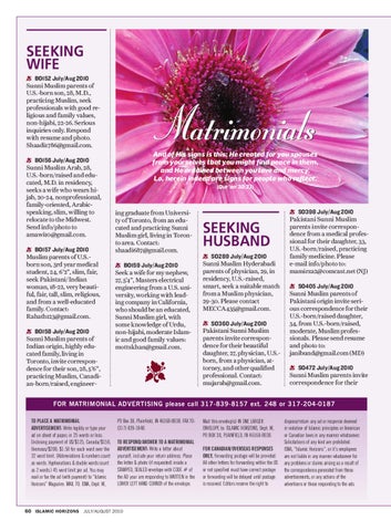 FOR MATRIMONIAL ADVERTISING please call 317-839-8157 ext. 248 or 317-204-0187 TO PLACE A MATRIMONIAL ADVERTISEMENT: Write legibly or type your ad on sheet of paper, in 25 words or less. Enclosing payment of US/$125, Canada/$150, Overseas/$200; $1.50 for each word over the 32 word limit. (Abbreviations & numbers count as words. Hyphenations & double words count as 2 words.) 45 word limit per ad. You may mail or fax the ad (with payment) to “Islamic Horizons” Magazine. MAIL TO: ISNA, Dept. M,