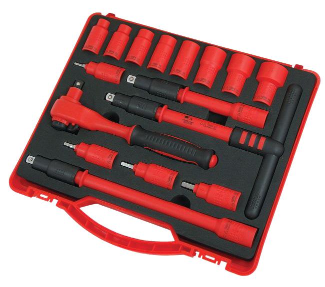 Insulated Tool Kit, 3/8” Drive, VDE Certified for live working up to 1,000V AC / 1,500V DC. A basic socket set to cover common service and repair needs when working on Electric and Hybrid vehicles. VDE/GS certified and IEC60900 approved for safe work up to 1,500 Volts DC.