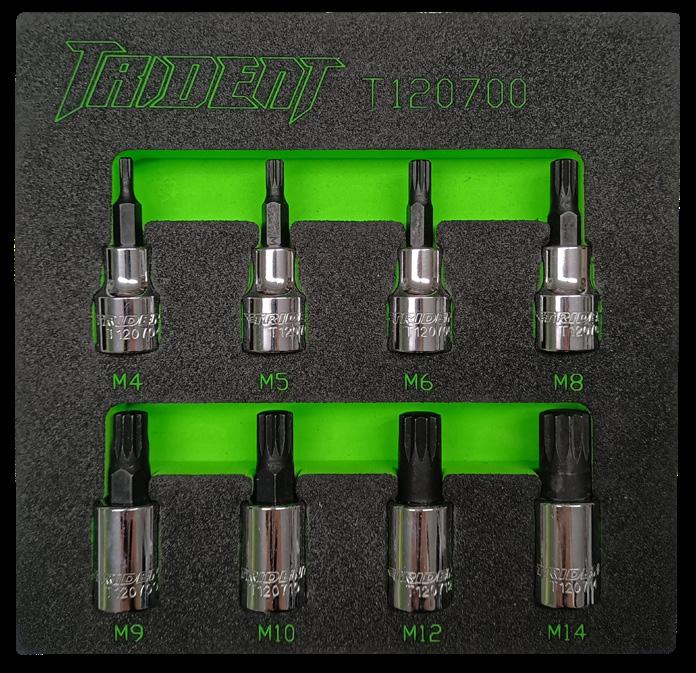 Spline Bit Set 3/8" DR M4-M14 T120700EVA ▪ Includes: M4, M5, M6, M8, M9, M10, M12 & M14 ▪ Length - 50mm ▪ Supplied in EVA Foam 16PC 3/8" Dr Trident VDE Set T127050EVA • For hybrid and electric vehicles