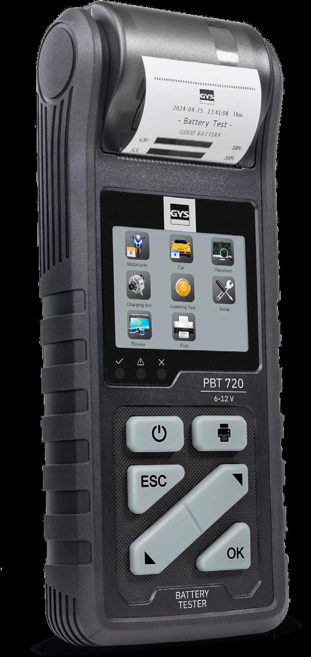 • Tests 6/12 V batteries, starters, and 6/12/24 V alternators with accurate voltage, state-of-charge, and current ripple measurements