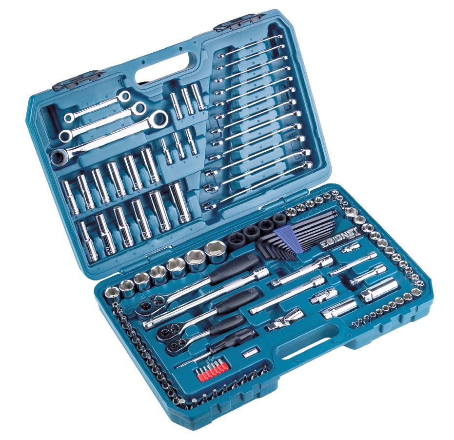 • Comprehensive 127-piece metric set with 1/4”, 3/8”, and 1/2” drive sizes for versatile mechanical applications