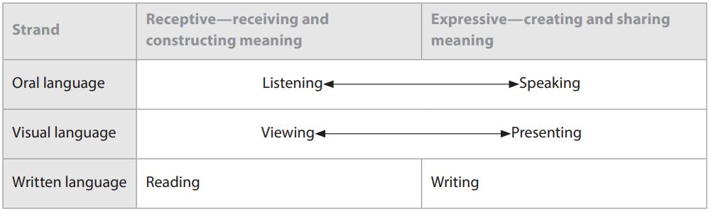 language learning. Each strand has been considered from both the receptive aspect receiving and constructing meaning, and expressive aspect creating and sharing meaning. While the receptive and expressive aspects are clearly reciprocal, the processes involved in receiving and constructing meaning are different from those involved in creating and sharing meaning. The learner’s ability to understand language and use it effectively varies in different situations and from one individual to another For this reason, it is important to distinguish between these two modes of learning and the demonstrated proficiencies associated with them For example, a learner may listen attentively and reveal understanding through written or visual representations, but may require support to communicate ideas orally in the classroom