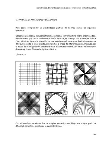 Para poder comprender las posibilidades gráficas de la línea realiza los siguientes ejercicios: Utilizando una regla y escuadras traza líneas rectas, con tinta china negra, organizándolas de tal manera que con la unión o interacción de éstas, se obtenga una estructura rítmica. Estos ejercicios tienen la intención de que practiques el manejo de los instrumentos de dibujo, buscando el trazo exacto, sin manchas o líneas de diferente grosor. Después, con la ayuda de tu imaginación, desarrolla otras estructuras lineales con base a los conceptos de orden y ritmo. Observa la siguiente lámina. LÁMINA XIII