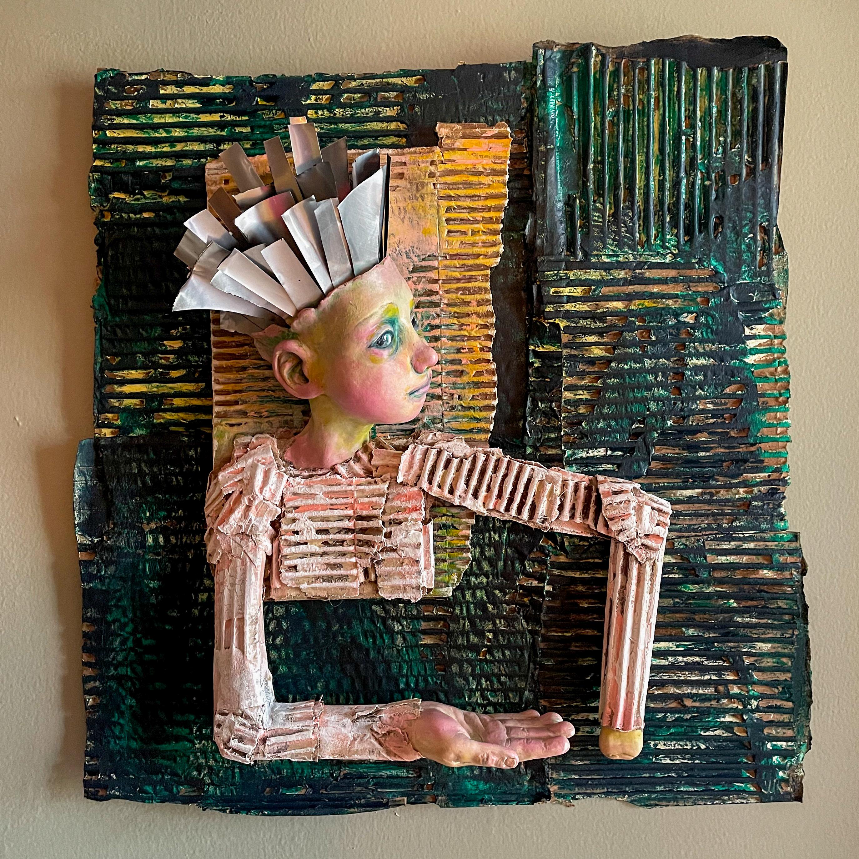Thiscardboardartdoll apiecethat,likemanyofmyworks, exploreslimbdifferenceinawaythatfeelsbothpersonaland alittlewhimsicalShe’smadefromlayersofreclaimed cardboard,polymerclay,ApoxieSculpt,rustywire,salvaged leather,andacrylicpaint
