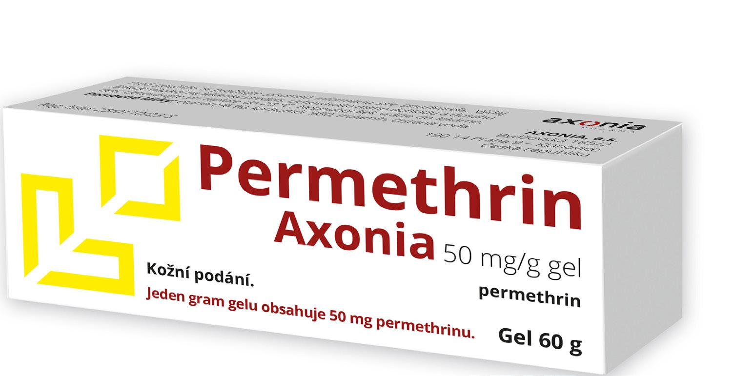 Název a složení: Permethrin Axonia 50 mg/g gel. Jeden gram gelu obsahuje 50 mg permethrinu. Indikace: Léčba svrabu u dospělých a dětí starších 2 měsíců. Dávkování a způsob užívání: Dospělí a dospívající starší 12 let: Naneste až 30 g gelu (odpovídá jedné 30g tubě nebo ½ 60g tuby). Děti ve věku od 6 do 12 let: Naneste až 15 g gelu (odpovídá ½ 30g tuby nebo ¼ 60g tuby). Děti ve věku od 2 měsíců do 5 let: Naneste až 7,5 g gelu (odpovídá ¼ 30g tuby nebo 1/8 60g tuby). V případě ošetření obličeje, uší nebo vlasaté části hlavy, může být použita vyšší dávka. Starší pacienti (nad 65 let): Aplikujte na celé tělo včetně krku, obličeje, uší a vlasaté části hlavy. Vyhněte se oblasti blízko očí. Dospělí a dospívající: Aplikujte na celé tělo mimo vlasatou část hlavy a obličej, pokud tyto oblasti nejsou postiženy. Děti starší 2 let: Aplikujte na celé tělo. Vyhněte se oblasti kolem úst a očí. Děti ve věku od 2 měsíců do 2 let: Používejte pouze pod lékařským dohledem. Aplikujte na celé tělo včetně krku, obličeje, uší a vlasaté části hlavy. Vyhněte se oblasti kolem úst a očí. Gel ponechte na kůži po dobu 8-14 hodin. Poté celé tělo důkladně omyjte. Osoby, které jsou v kontaktu s postiženou osobou, mají být ošetřeny současně, i když nevykazují příznaky nákazy. Úspěšnost léčby je při jednorázové aplikaci přibližně 90 %. V případě neúspěchu léčby (nejsou-li známky hojení původních lézí nebo se objevily nové léze a podkožní chodbičky) lze provést druhou aplikaci nejdříve 7 dní po první aplikaci. Kontraindikace: Hypersenzitivita na léčivou látku nebo jiné látky ze skupiny pyrethrinů. Upozornění: Pouze pro kožní podání! Interakce: Nejsou známy. Fertilita, těhotenství, kojení: Není znám významný vliv permethrinu na fertilitu či reprodukční toxicitu. Během používání a minimálně týden po aplikaci se doporučuje zdržet se kojení. Nežádoucí účinky: Nejčastěji mírné a přechodné kožní reakce, jako je vyrážka, svědění a kožní parestezie. Balení: Tuba s 60 g gelu. Uchovávání: Při teplotě do 25°C. Držitel rozhodnutí o registraci: AXONIA, a.s., Bydžovská 185/2, 190 14 Praha 9. Datum revize textu: 13. 6. 2023. Přípravek je vázaný na lékařský předpis a je hrazený z prostředků veřejného zdravotního pojištění. Před předepsáním se seznamte s úplnou informací o přípravcích v Souhrnu údajů o přípravku.
