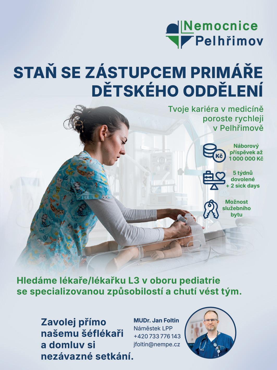 Do zavedené oční ordinace s optikou v Praze 3 hledáme lékaře/ku na plný nebo částečný úvazek. Ordinace moderně vybavená pro poskytování plné ambulantní péče na vysoké úrovni a možnost osobního rozvoje v diagnostice očních patologií. Kontakt: 773 952 600 Nemocnice Na Františku, Praha 1 přijme na DPČ lékaře, lékařky L3/L2 do lékařské pohotovostní služby Rozsah spolupráce: pracovní dny 17–22 hod., víkend 10–22 hod. Nabízíme možnost pravidelné dlouhodobé spolupráce, vhodné jako doplněk k hlavnímu úvazku. Kvalifikační předpoklad lékař L3 specializace (atestace) v oboru všeobecné praktické lékařství, vnitřní lékařství, chirurgie, anesteziolog; lékař L2 základní kmen v oboru všeobecné praktické lékařství, vnitřní lékařství, chirurgie nebo anesteziologie Nabízíme nadstandardní platové podmínky, ostatní informace na www.nnfp.cz/job/lekar-l3-l2-lekarska-pohotovostni-sluzba nebo informace na tel. 222 801 370, personální odd. Vlčková Yvona Přijmu lékařku/lékaře do urologické ambulance v Praze 8. Úvazek na 1 den v týdnu. Je možný i kratší úvazek (např. 1/2 den – 4 hodiny). Naopak je možné i rozšíření úvazku (např. 2–3 dny). Vhodné i pro lékaře v důchodu či lékařku na rodičovské dovolené. Kontakt: privatni.urologie@seznam.cz Dermatolog/žka po kmeni do soukromé amb. SalEste clinic v Brně. Spokojenost, flexibilita, telemedicína, sál, zahraniční stáž, podpora kolegy, motivující ohodnocení. Rádi vás pozveme na nezávaznou kávu a prohlídku pracoviště. Kontakt: secl@email.cz Moderní pracoviště sportovní medicíny v Praze 4 hledá výhradně lékaře se specializací v oboru tělovýchovné lékařství. Specializujeme se na sportovní prohlídky a zátěžovou diagnostiku. Hledáme profesionála se zájmem o práci se sportovci, spolehlivou a týmově orientovanou osobnost. Úvazek a podmínky dle dohody. V případě zájmu nás prosím kontaktujte: 792 314 456, info@sportmedical-diagnostics.cz