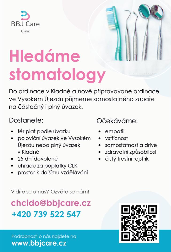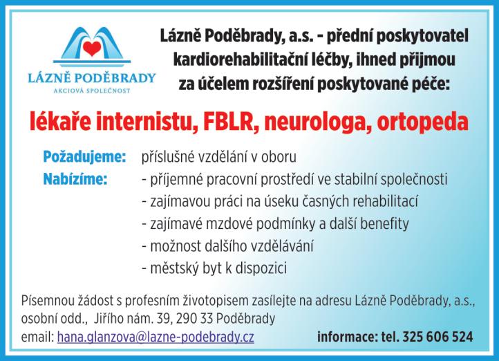 Mimo jiné nabízíme nadstandardní finanční ohodnocení, které odpovídá vaší kvalifikaci a zkušenostem, zajištění dalšího vzdělávání, podporu a přátelský přístup ze stran zaměstnavatele a kolegů. Kontakt: Angelina Bashkatova, 725 421 907, management@swissmeds.cz Nabízím práci lékaři/lékařce v kompletně zavedené ORL ordinaci na poliklinice ve Stráži pod Ralskem. Kontakt: 737 156 256 Soukromé zdravotnické zařízení s ordinacemi na Praze 5, 6, 9 a v Černošicích přijme angiologa na HPP i DPP. Platové podmínky: 100–300 000 Kč dle výše výkonů. Bydlení v Praze zdarma, pouze služby. Kontakt: 733 738 394, keltiamedadmin@centrum.cz