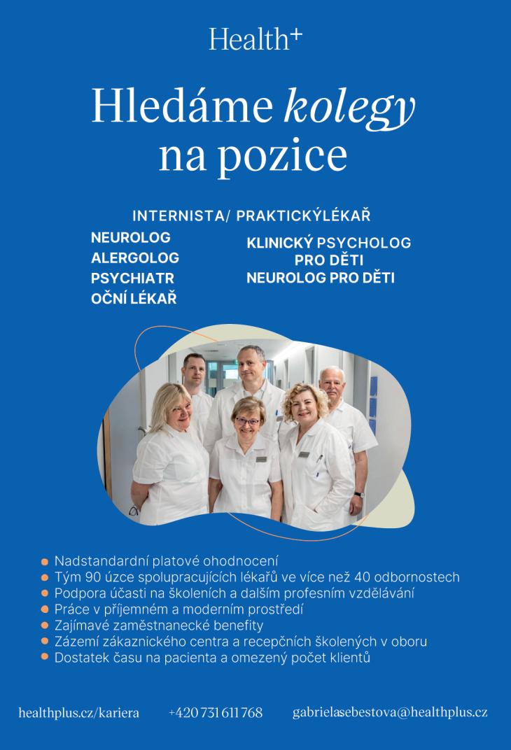 středí s širokým spektrem aferézních technik • perspektivní a zajímavou práci na hlavní pracovní poměr u stabilního zaměstnavatele • samostatnou a odpovědnou práci v malém kolektivu • možnost osobního i profesního růstu a podporu dalšího vzdělávání (vč. specializace). Jakou o vás máme představu? • VŠ vzdělání v akreditovaném magisterském studijním oboru všeobecné lékařství • atestace ze základního kmene nebo jeho brzké dokončení, specializovaná způsobilost v oboru hematologie a transfuzního lékařství výhodou • schopnost pracovat samostatně i v týmu • aktivní přístup k práci a zodpovědnost • ochota se vzdělávat a učit se něčemu novému. V případě zájmu prosím zašlete svoje CV a motivační dopis na adresu Zdenka.Bhuiyanova@uhkt.cz VPL Praha 3. Lékař se spec. způsobilostí či po kmenu. Zavedená moderně vybavená ordinace. Úvazek dle možností. Plat se spec. způsob. 120 000 Kč hrubého/měsíc při úvazku 1,0 + odměny. Výborné admin. zázemí, zkušená sestra. Příspěvek na vzdělávání 15 000 Kč/rok. Stravenky + jiné benefity. 5 týdnů dovolené, 3 dny sick days. Lze i pro lékaře po kmenové zkoušce, ordinace má akreditaci a školitele VPL. Kontakt: praxePL@email.cz, 604 305 825