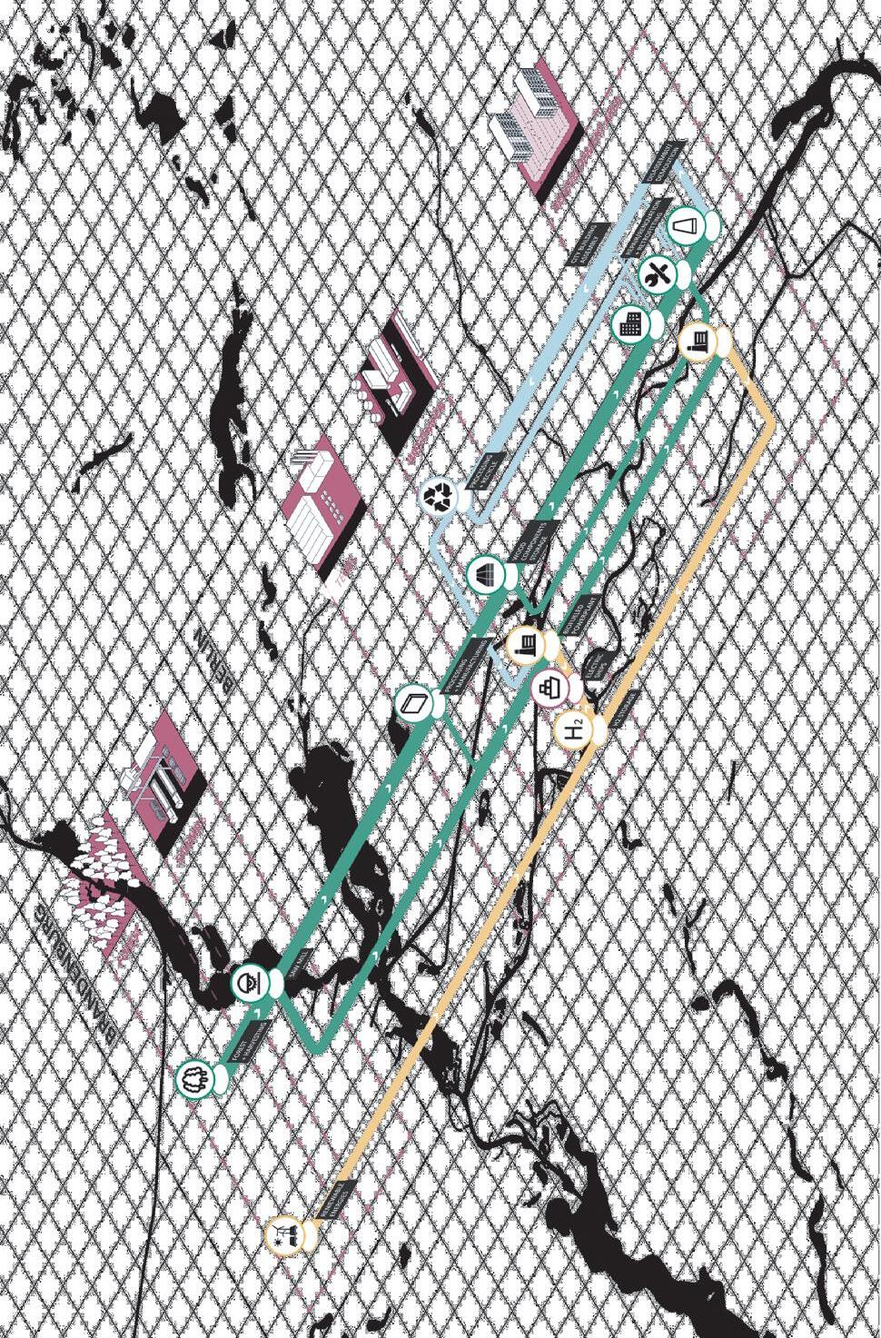 H2 TERMINAL H2 H2 H2 MATERIALS PROCESSes ENERGY SOCIAL RECYCLING RE [ log ] WOOD COmPONENTS Freight shipping Recycling material biomass / Energy recharging station socio-cultural area