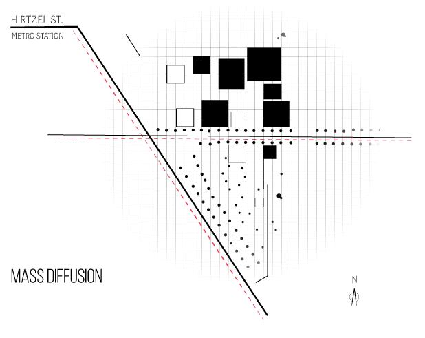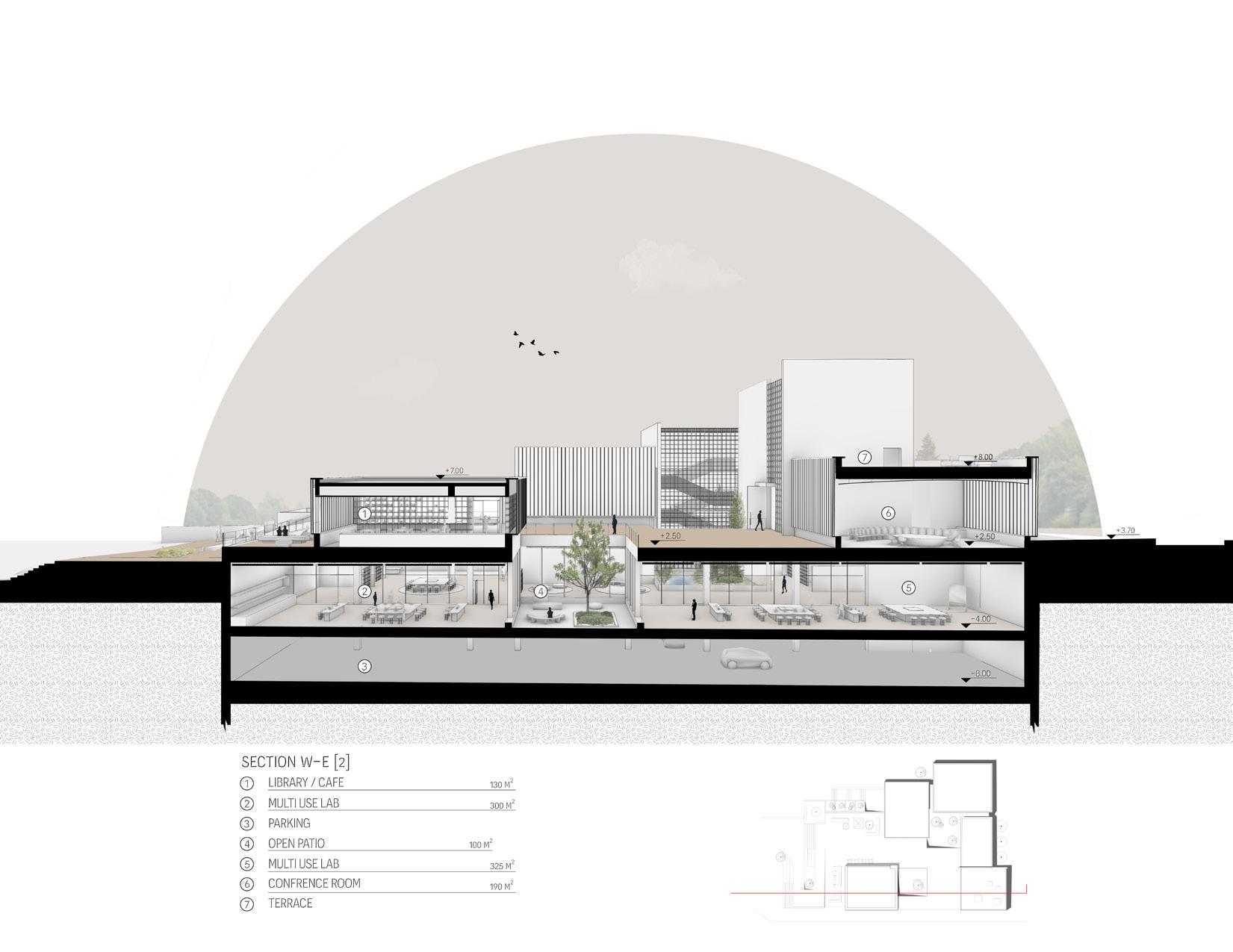 The pruposed scheme offers new public space in the city welcoming visitors from outside the campus to peak inside, exposing scientests to new opportunities or having city dwellers to enjoy the new green open space.