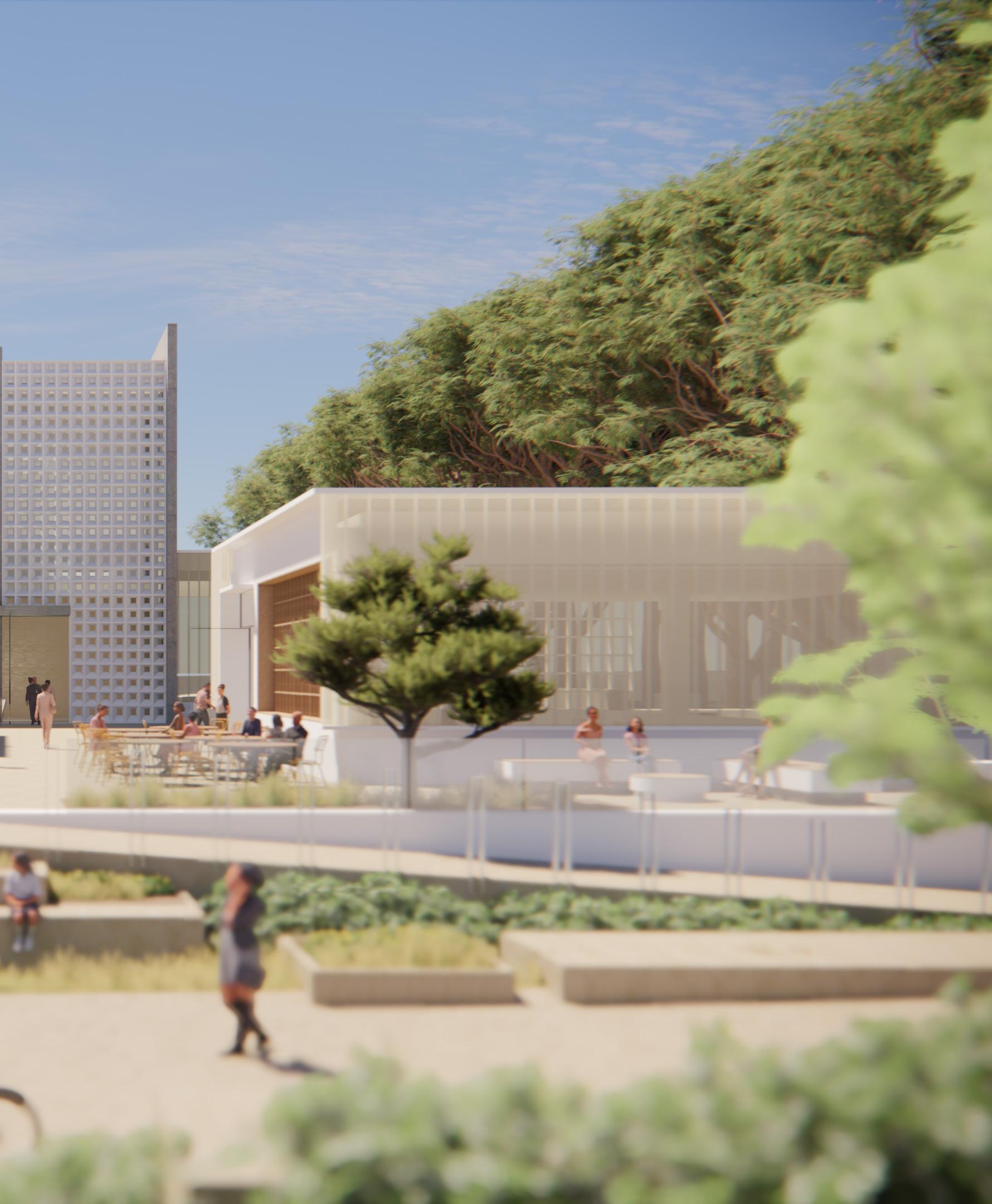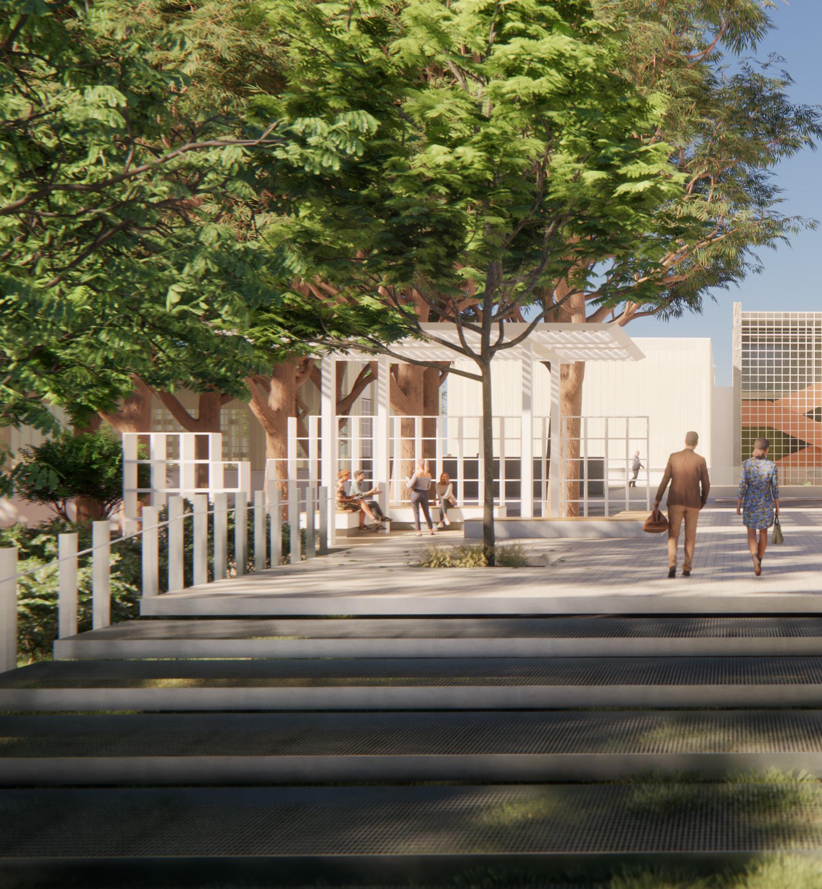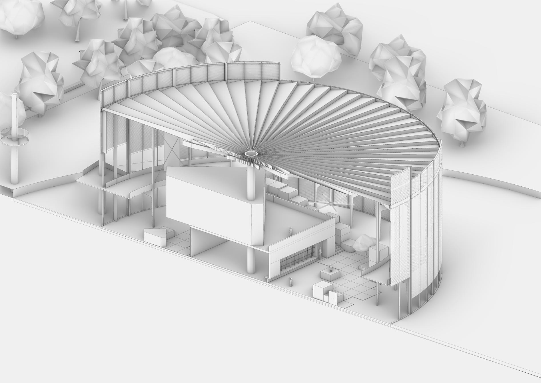 The proposed plan aims to pay homage to the extensive variety of unique trees on the site by utilizing their shaded areas for communal gatherings. The arrangement of the above-ground structures has been designed to align with the historical ficus trees located on the southern side of the site. The lower volumes are positioned closest to the trees, with the higher volumes situated further away.