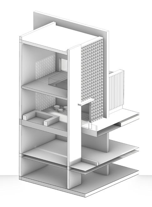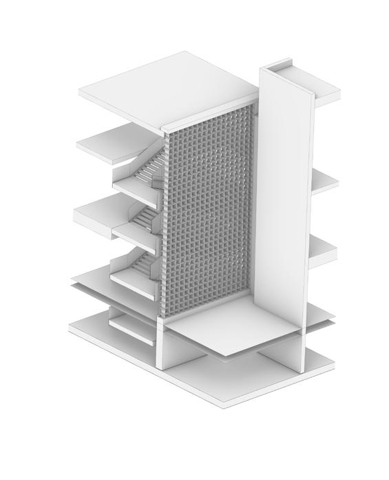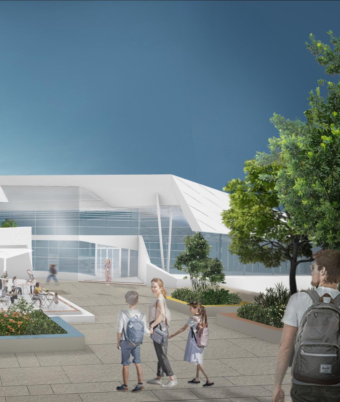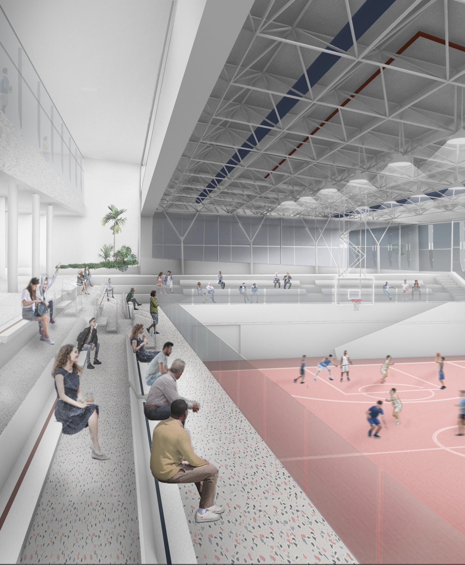 The design prioritizes interaction and engagement at every level. The openings of the sports hall offer passersby a live glimpse of the action inside, enriching the urban experience for commuters. At the main level, strategically positioned at +3 meters, a café invites visitors to linger and socialize, fostering a sense of community. By blurring the boundaries between the built environment and the surrounding nature, our project cultivates a biophilic symbiotic relationship, enhancing the overall well-being of users and the ecosystem.