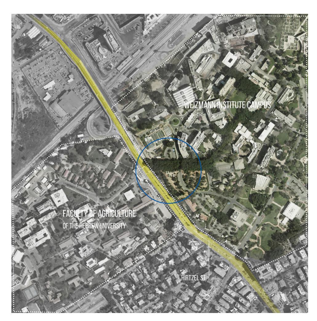 On the campus border LINKING the campus with the city