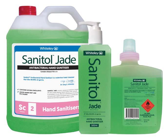 Sanitol™ Jade Antibacterial Hand Sanitiser kills 99.99% of germs, helping to protect you from a broad range of bacteria. Infused with a refreshing lemon and mango fragrance. Sanitol™ Jade not only leaves your hands clean but also smells fresh and tropical.