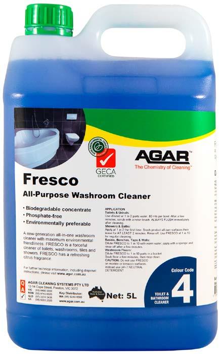 Fresco is an all-in-one washroom cleaner designed for showers, toilets and ceramic tiles. Its thickened formula clings to vertical surfaces, helping dissolve bio-waste, soap scum, urine and fat deposits. Fresco contains biodegradable surfactants and is certified by GECA as environmentally preferable.