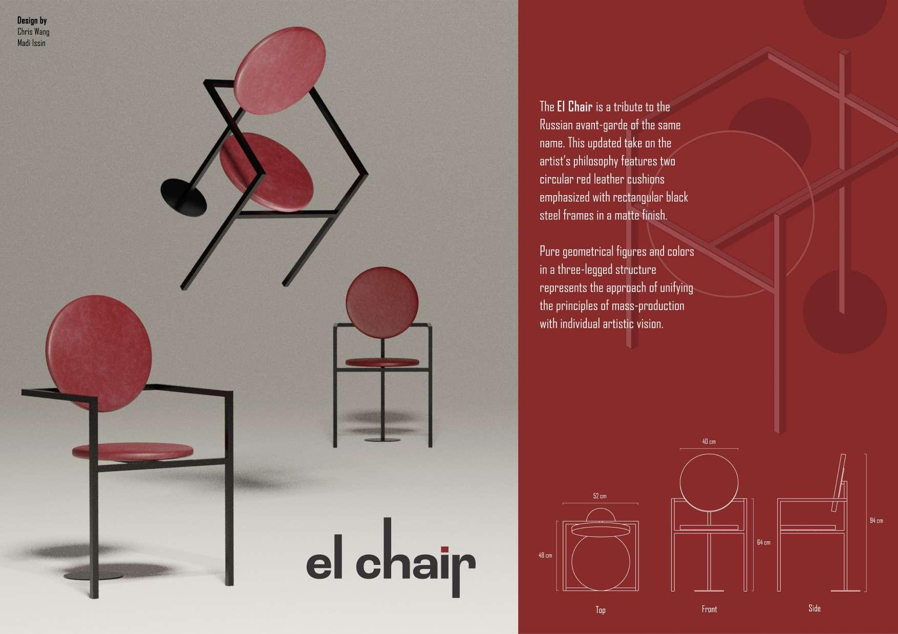 The "El Chair" was designed in the collaboration with Chris David Wang, big friend of mine. The chair was a part of the "Starchitect's Chair" competition organized by TheCharette. It was our first design competition, and the chair was listed in Top 30. More detailed description, you can find in the board.