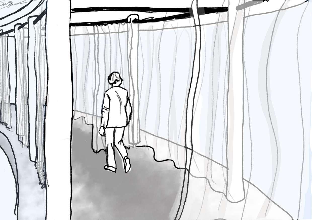 08 各階平面図 S=1:2002階平面図 5階平面図6階平面図7階平面図3階平面図4階平面図 椅子を設け中央の展示を眺める スチール丸棒と緑のカーテンがザッピングのように編み込まれたガラスとカーテンのスロープが朝の風景を演出するDOWNDOWNEV気持ちの良い空間を演出する 6階からEVで降りてくる人達が吊り下げられた展示くつろげる空間にした 空間同士に境界がなく、ぶつかりあう。壁が張り出し、迷路のような空間。 開口から差し込む光が流動的に流れ、スピード感を演出する 寄棟屋根の下にテレビがぽつんと赤と白の鉄骨。東京タワーという球体の空間。暗い空間内にあるテレビ型開口から入る光がテレビ画面に感じる電波塔のシンボルを彷彿とさせる置かれ、放送されている空間。