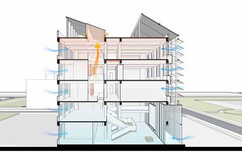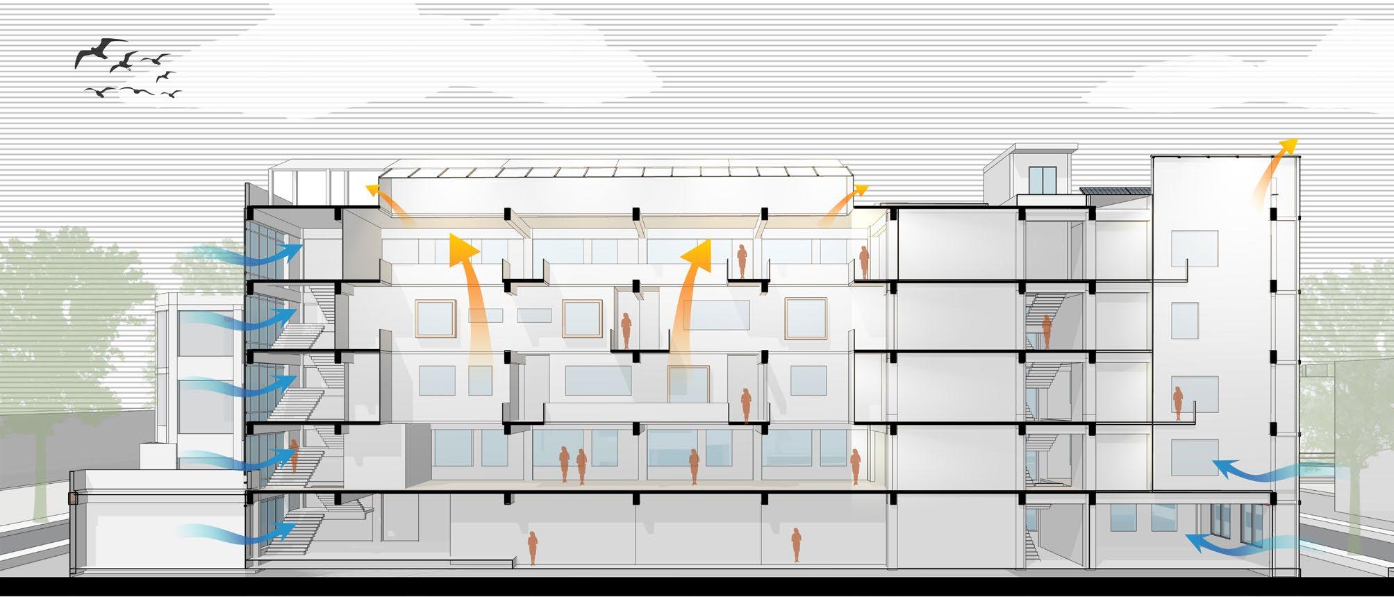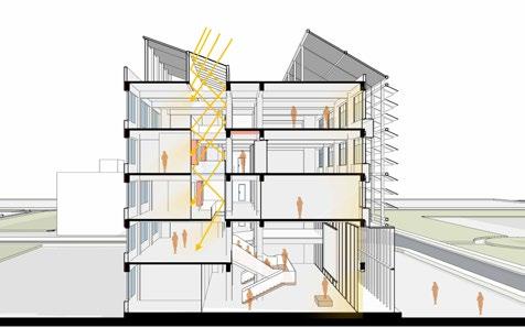 In order to solve these problems, We redesigned the building's interior spaces, new skylights and patios are able to bring in soft natural light to illuminate the corridors and open ground floor spaces. We have also installed folding photovoltaic panels and photovoltaic louvers that can change with the height angle of the sun on the exterior of the building, so as to make full use of solar power generation while controlling the brightness of the room