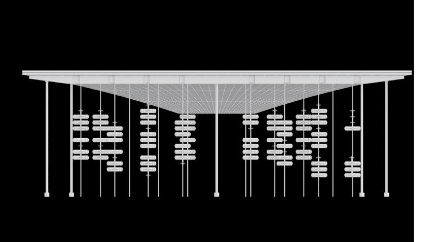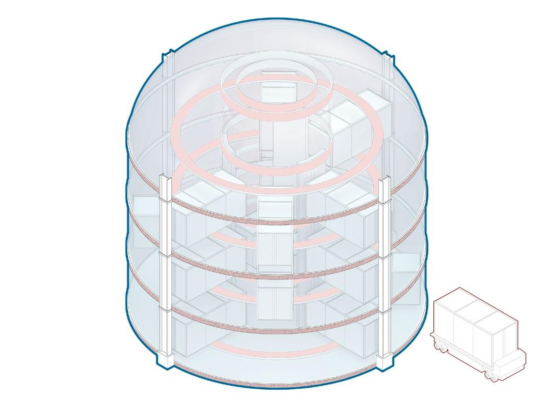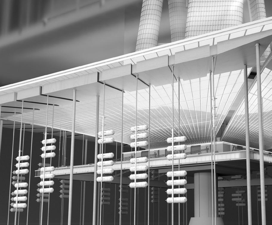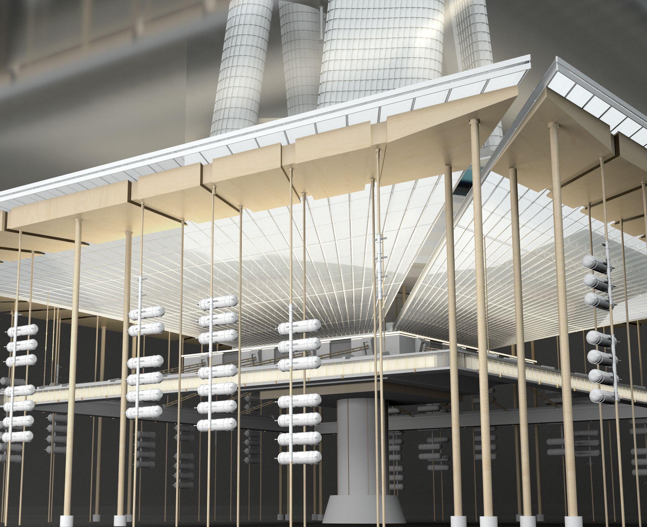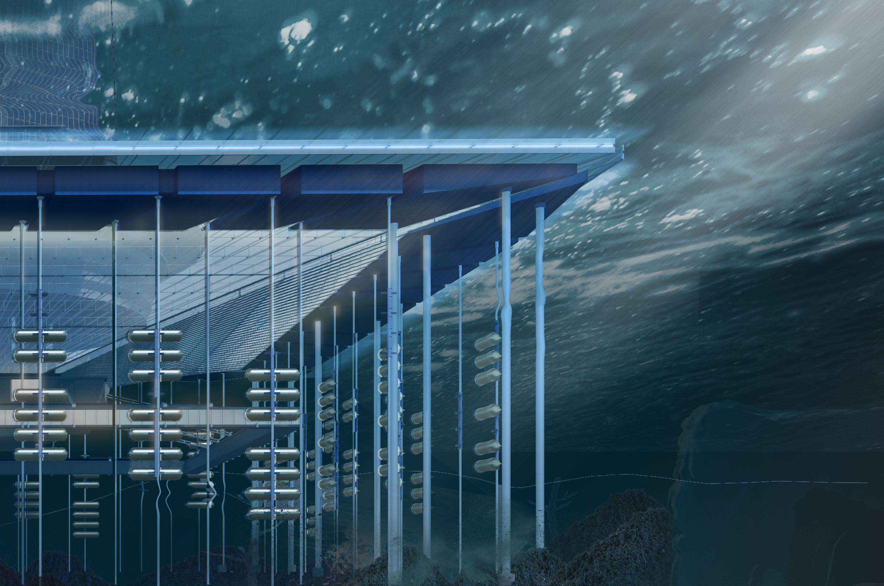 The huge hydrogen produc�on and storage area depends on the presence of a tensile structure, and several columns are divided into structural and storage types. A large number of hydrogen tanks in the storage area can be moved up and down freely, flexibly mee�ng energy needs