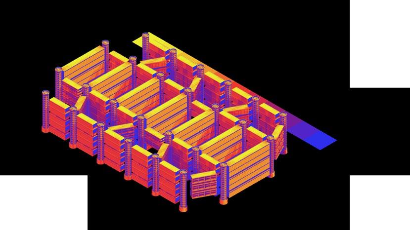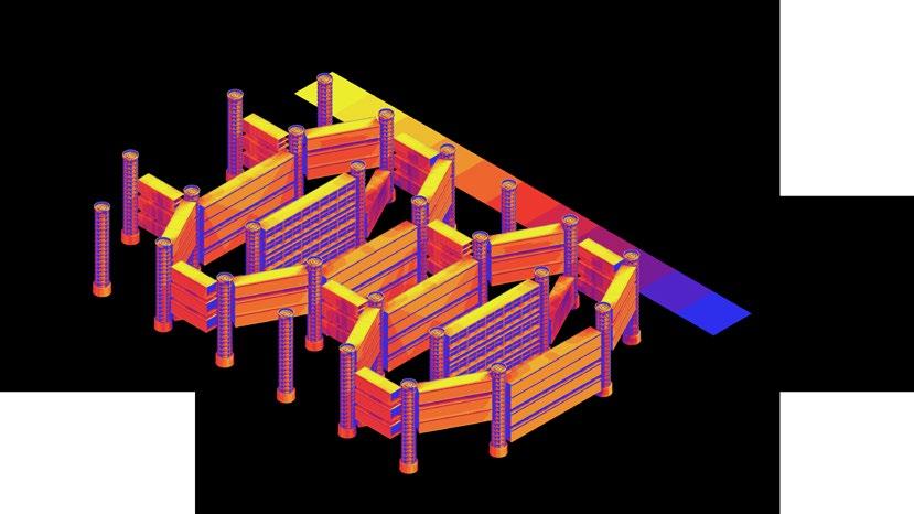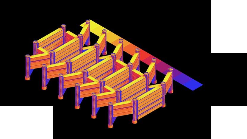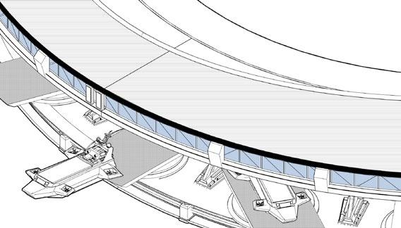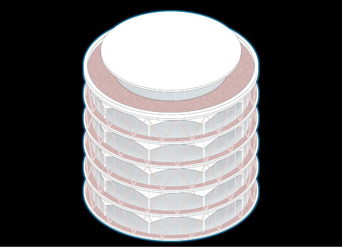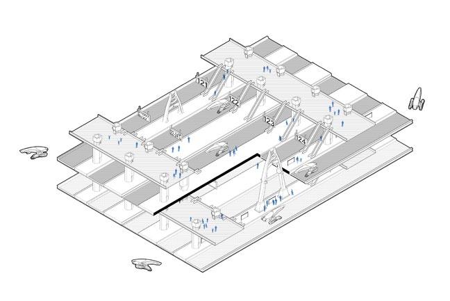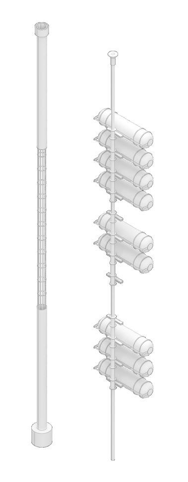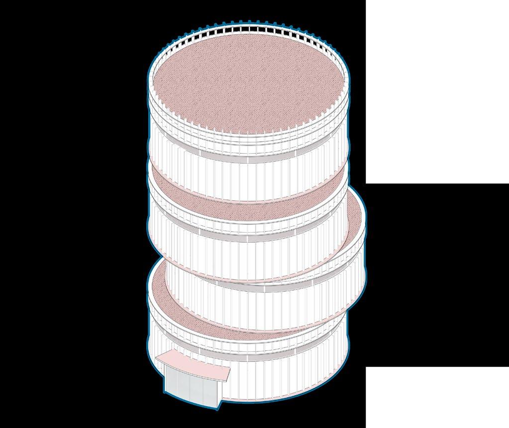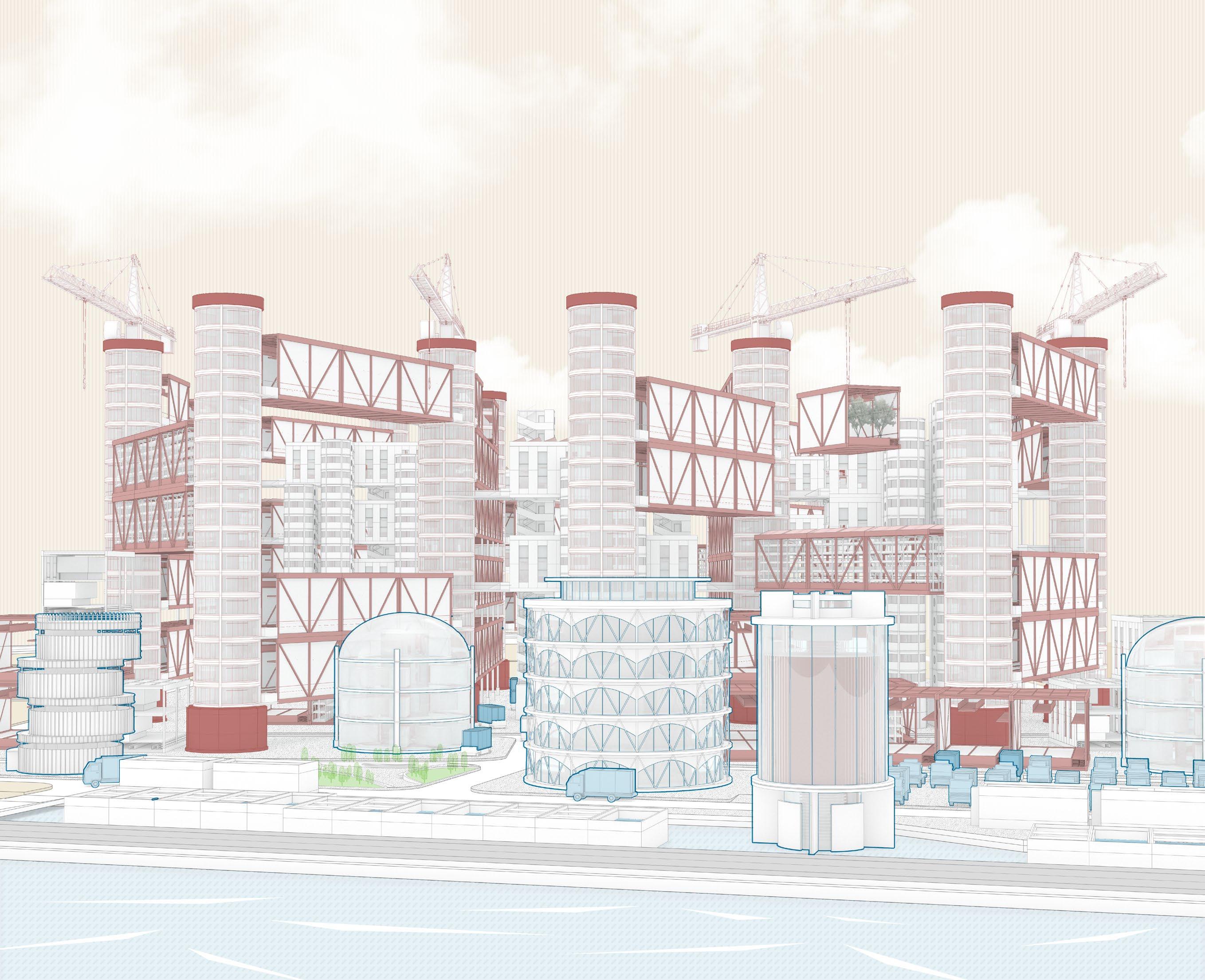 The huge hydrogen produc�on and storage area depends on the presence of a tensile structure, and several columns are divided into structural and storage types. A large number of hydrogen tanks in the storage area can be moved up and down freely, flexibly mee�ng energy needs