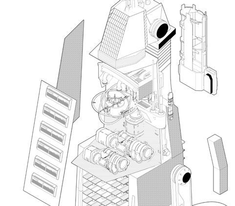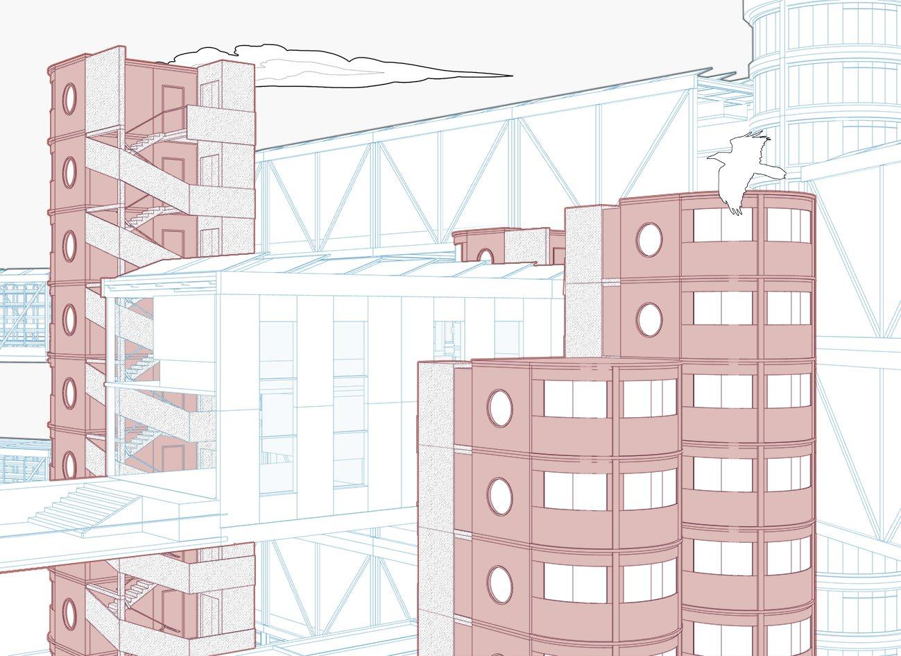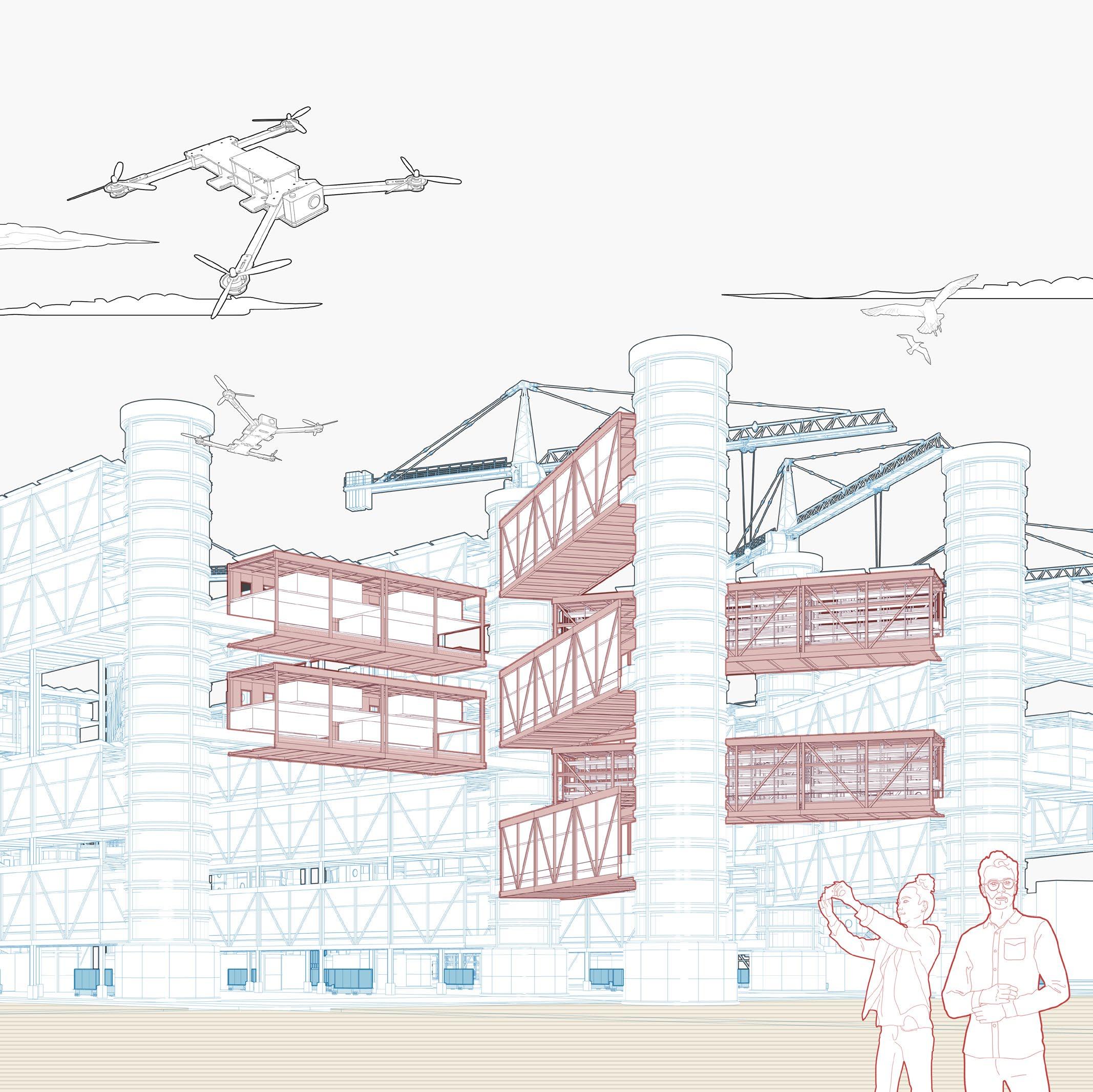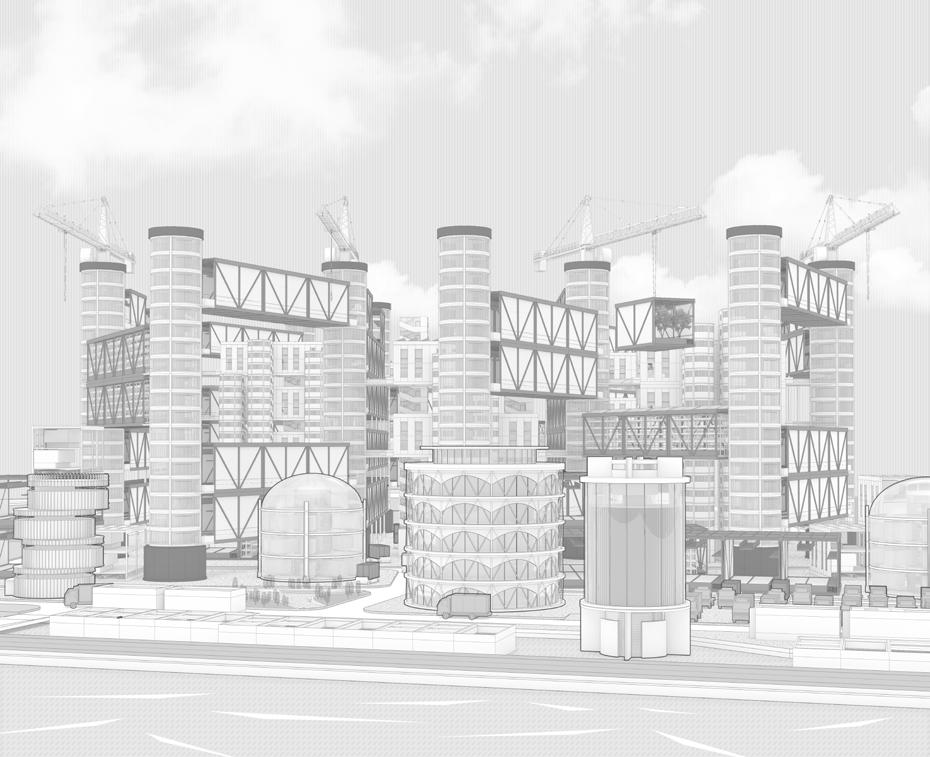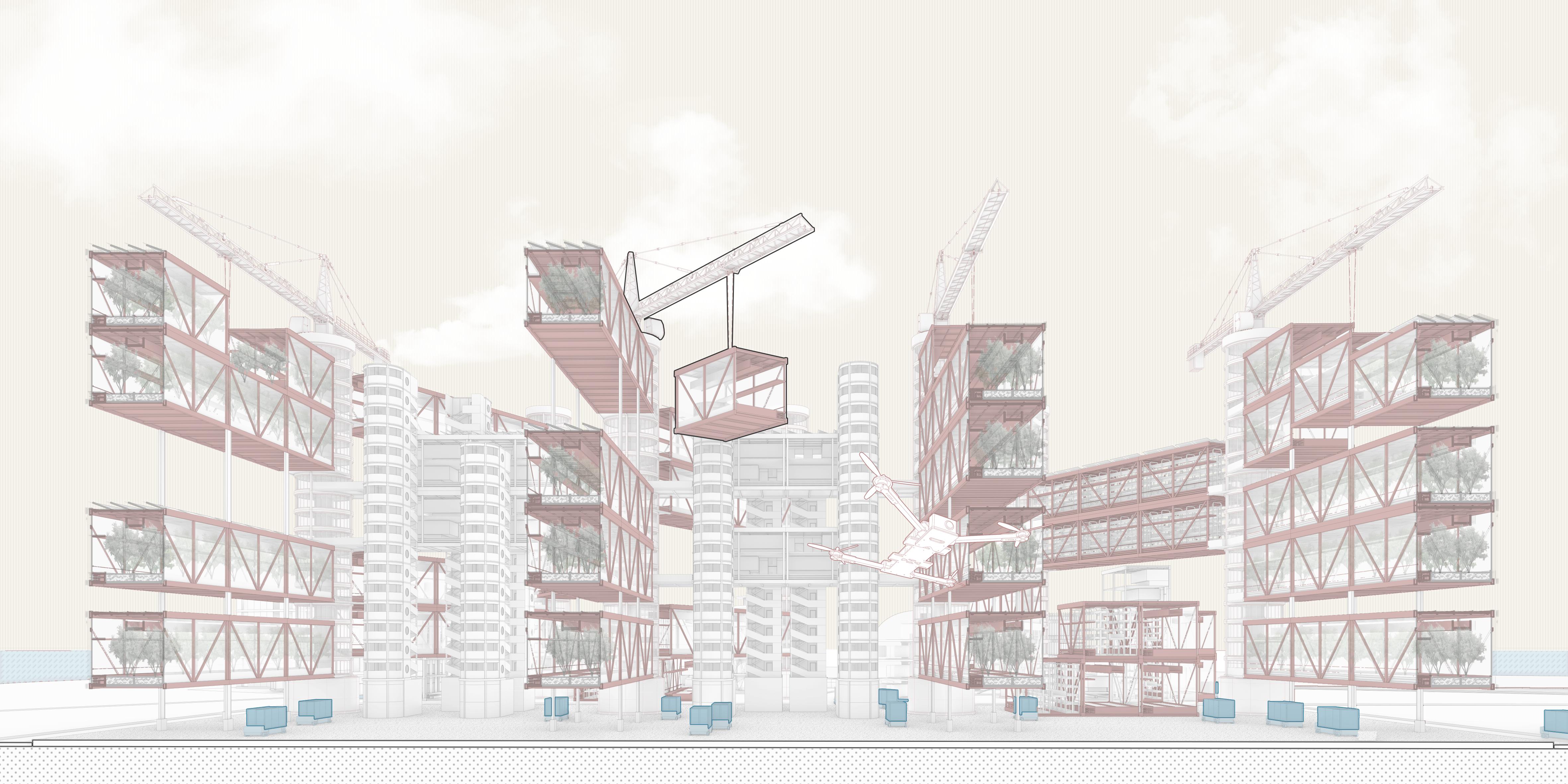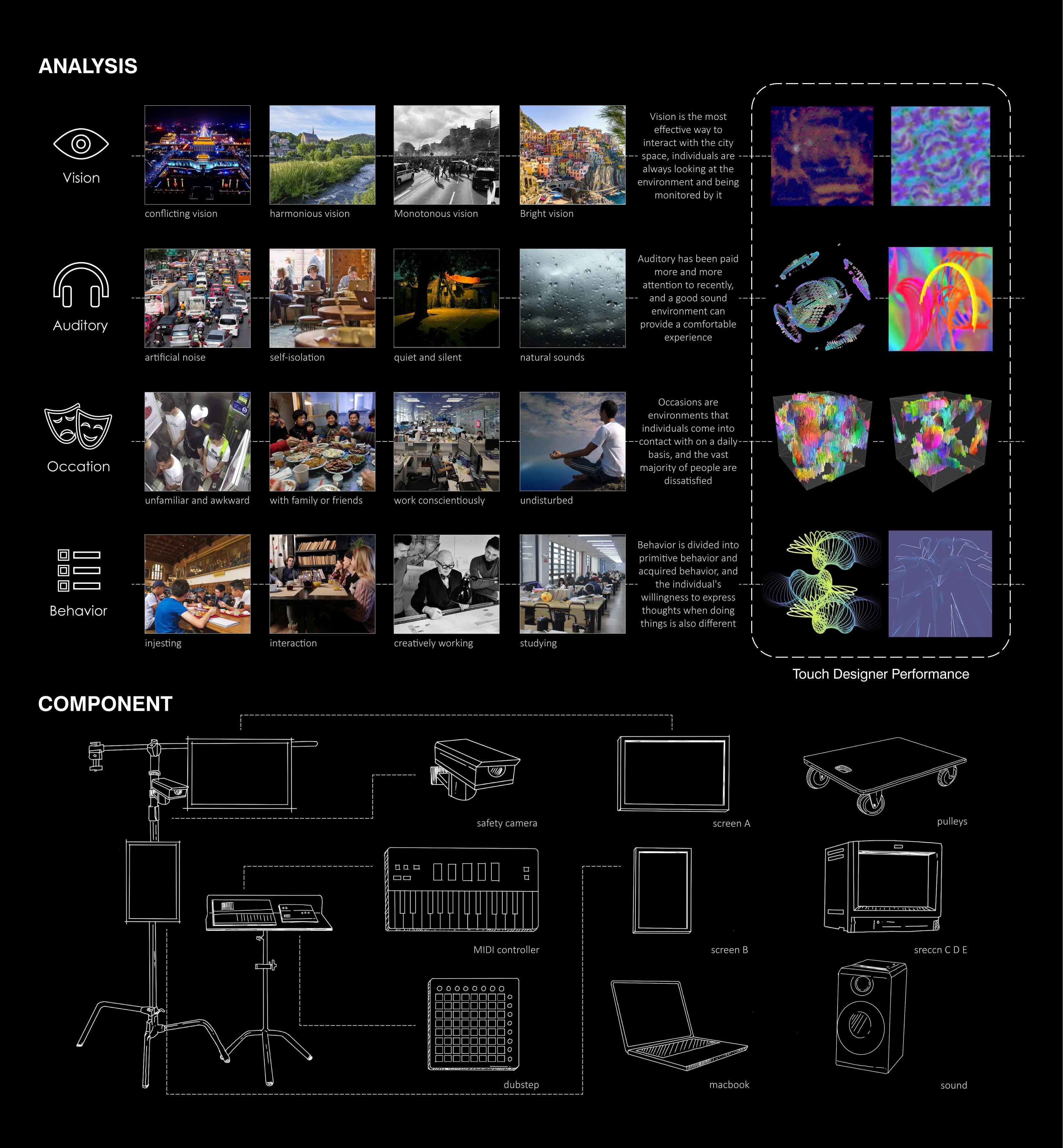 The plug-in city is a research and design carried out by Cook, which inserts movable metal silos as basic components into the giant concrete structure, and different functions correspond to different metal silos. When the community is connected, it is only necessary to insert these changing function blocks into the main building, and it is done immediately. Inspired by this idea, I think that the relationship between the individual and the urban environment can also be seen as being connected by various plug-ins, such as displays representing vision, surveillance cameras representing behavior, acoustic speakers representing hearing, and speakers