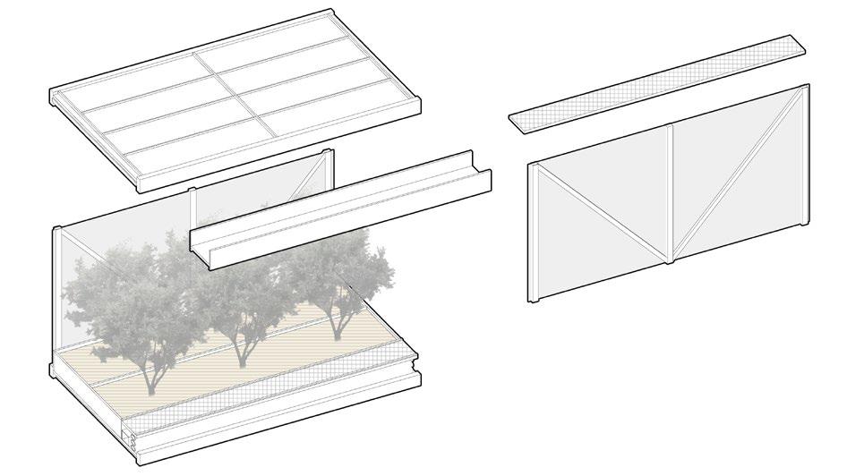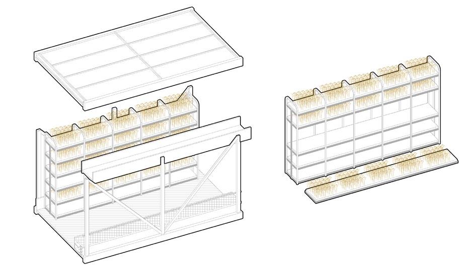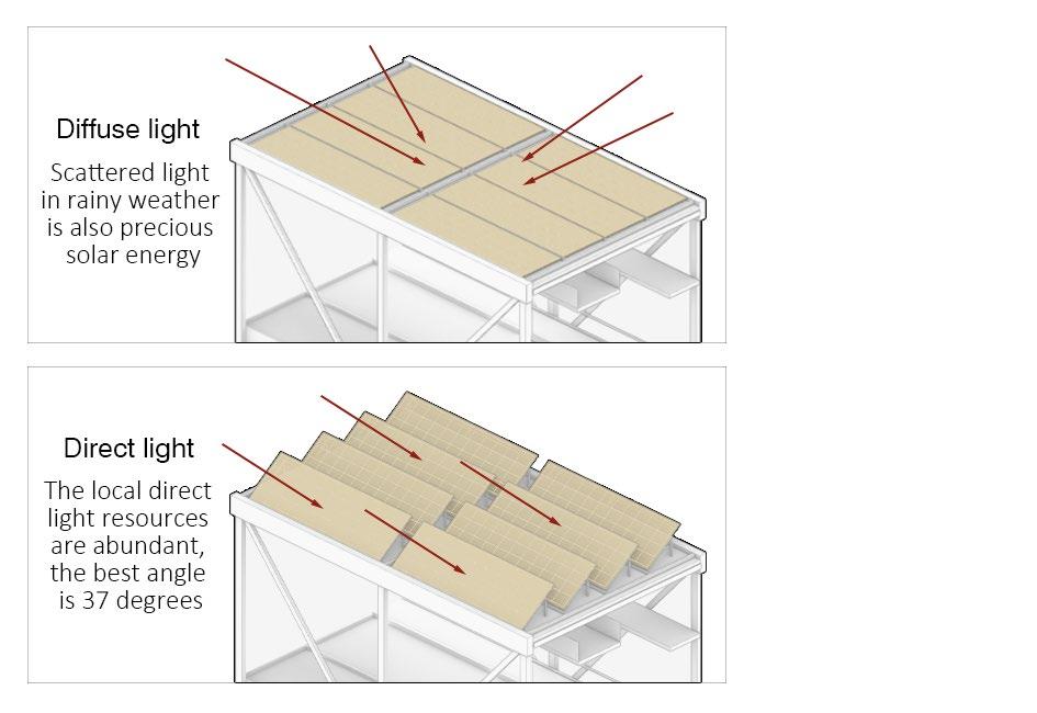 Bayberry is harvested in spring and summer, so the model pays a�en�on to the direct light resources of the sun, and symmetrically arranges produc�on units of reasonable height from west to east to ensure that sufficient light can be obtained throughout the day. Among them, living units are installed according to needs to meet produc�on needs