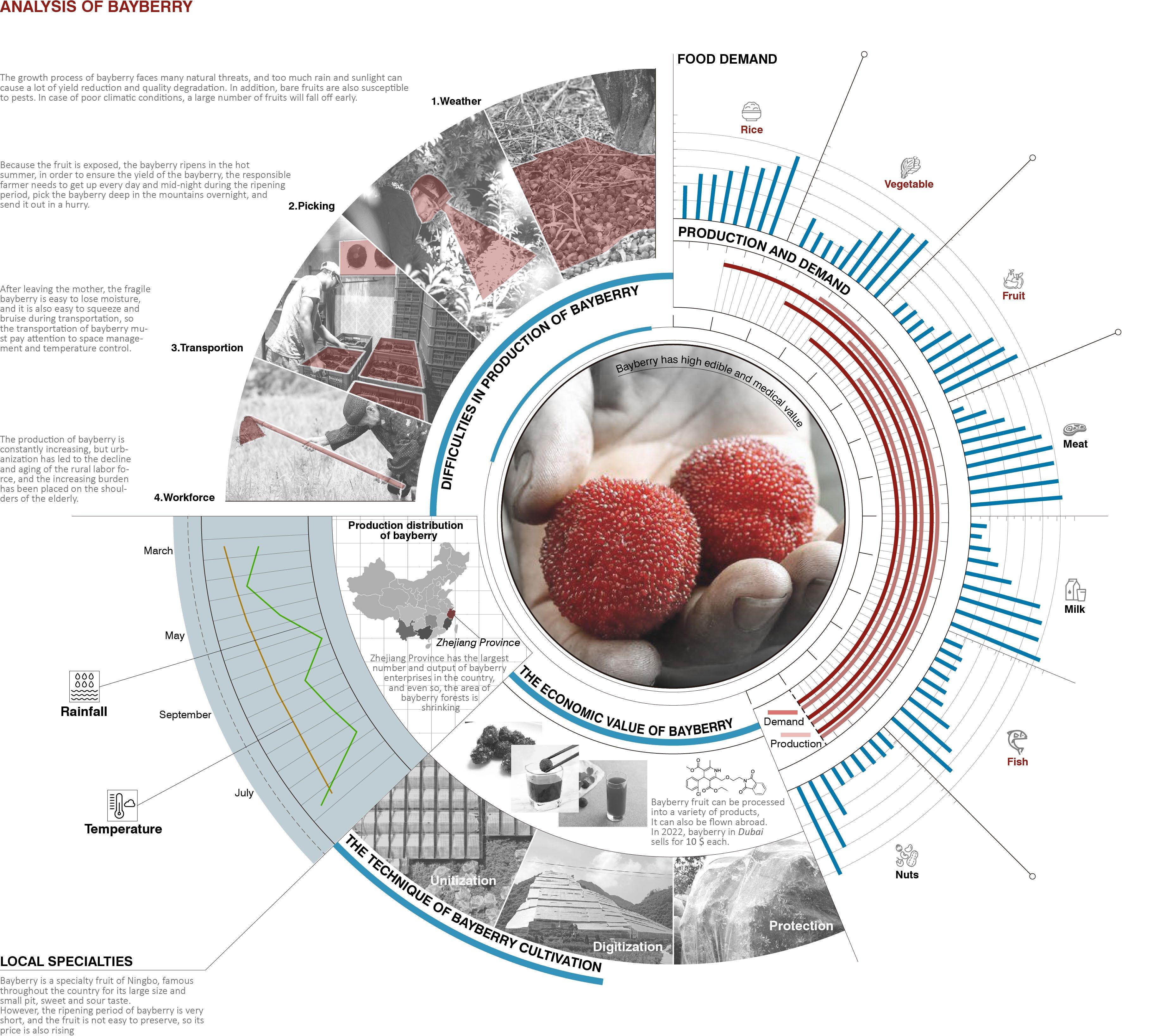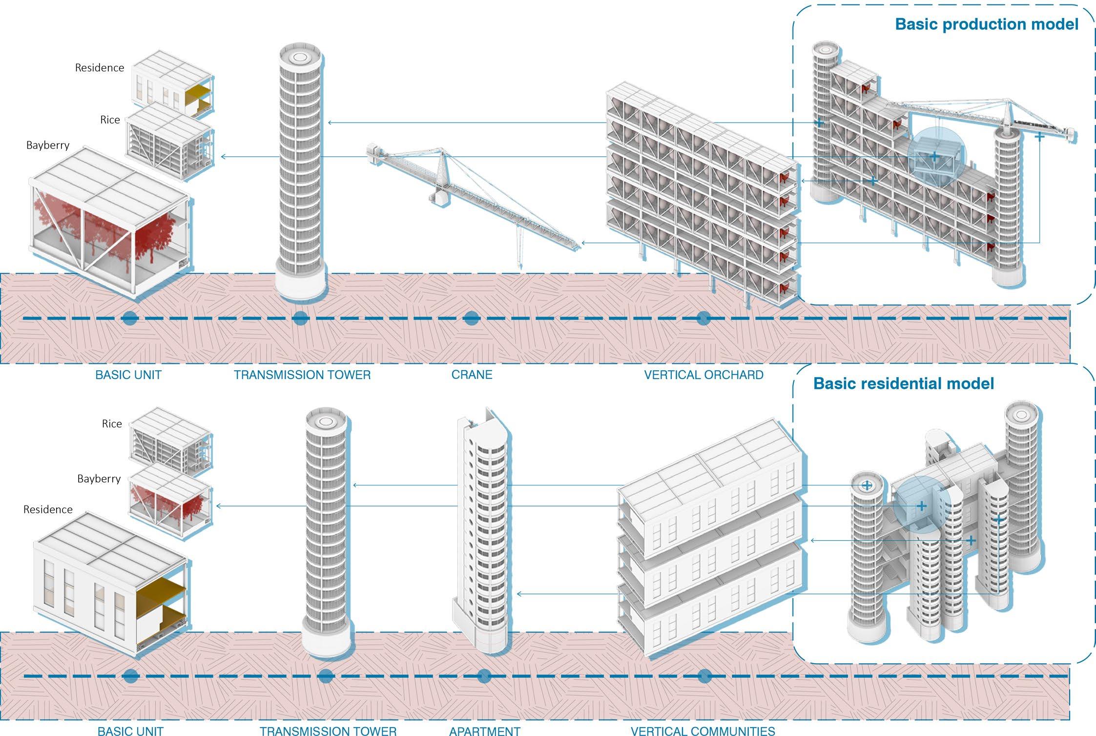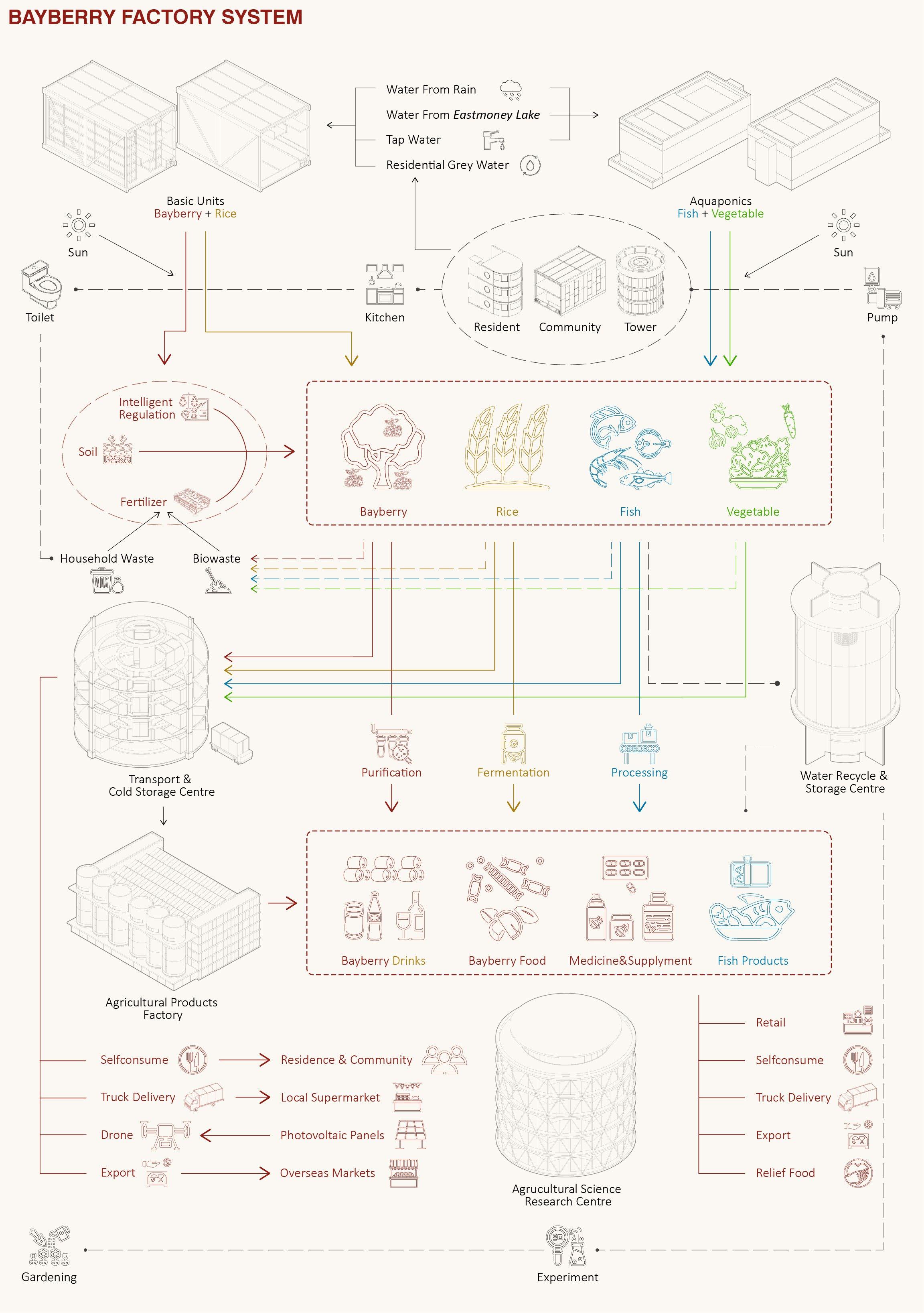 I started with local specialty fruits such as bayberry, which is difficult to preserve but has high economic value, as the main crop, and supplemented it with three other crops to improve yield and economic benefits. In response to the reduction of agricultural land, traditional fruit groves are crammed into modular units and then moved into the air, together with other functional units, to form a scientific and orderly combination model. This combination will be moved and reassembled by the tower crane with the season, forming a high-efficiency bayberry factory. In addition, the whole factory operates according to a system, in addition to the matching between crops, different auxiliary centers are involved in the recycling of production raw materials, the use of solar energy, the transportation of agricultural products, production, etc., and the workers are directly transformed by local farmers, these measures are to ensure sustainable economic and social development. This factory model is universal, and can be dominated by different crops in different regions to solve the contradiction between urban and rural areas.