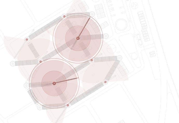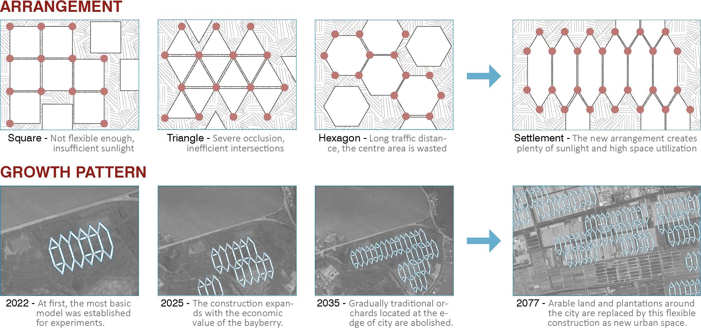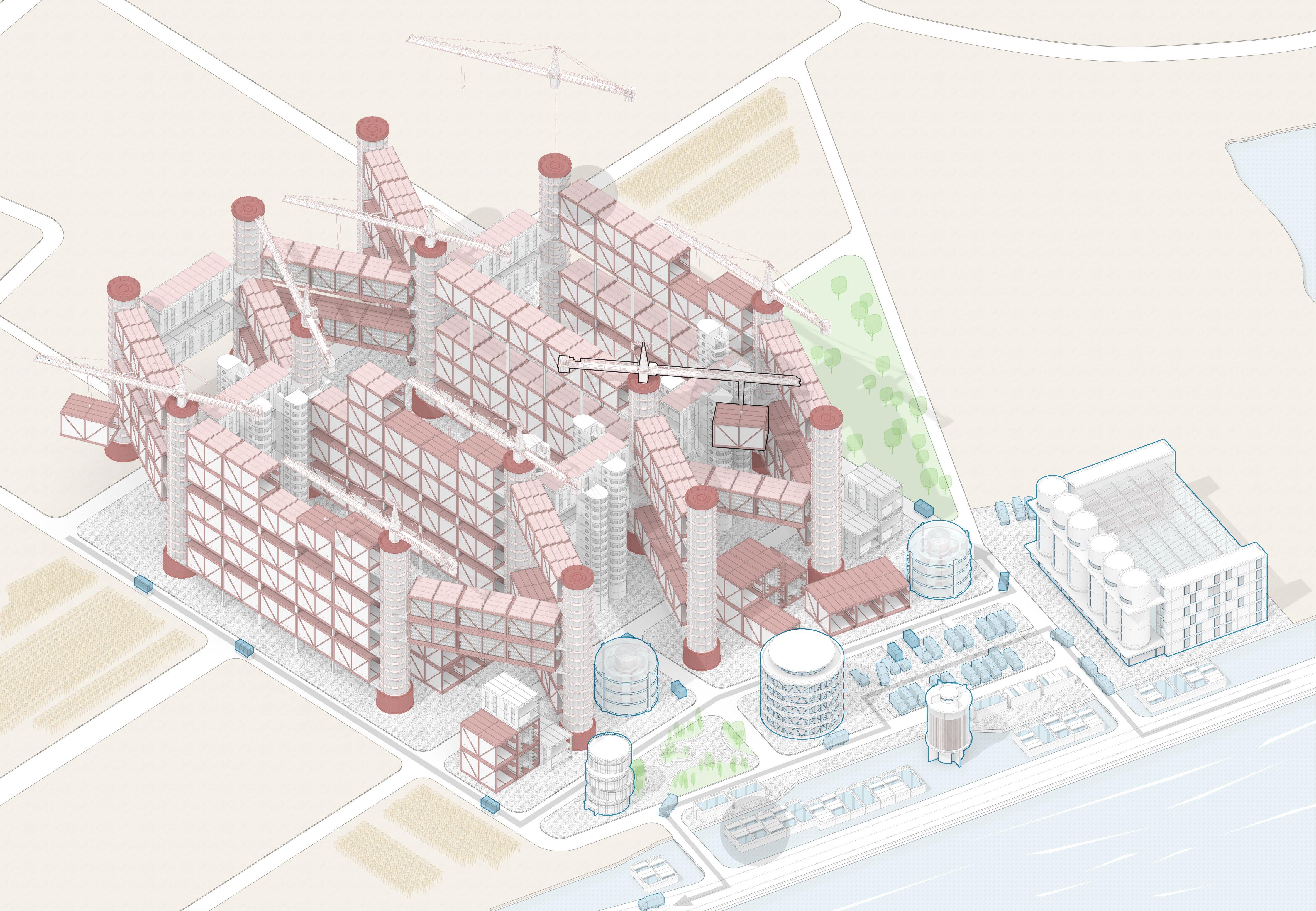 I started with local specialty fruits such as bayberry, which is difficult to preserve but has high economic value, as the main crop, and supplemented it with three other crops to improve yield and economic benefits. In response to the reduction of agricultural land, traditional fruit groves are crammed into modular units and then moved into the air, together with other functional units, to form a scientific and orderly combination model. This combination will be moved and reassembled by the tower crane with the season, forming a high-efficiency bayberry factory. In addition, the whole factory operates according to a system, in addition to the matching between crops, different auxiliary centers are involved in the recycling of production raw materials, the use of solar energy, the transportation of agricultural products, production, etc., and the workers are directly transformed by local farmers, these measures are to ensure sustainable economic and social development. This factory model is universal, and can be dominated by different crops in different regions to solve the contradiction between urban and rural areas.