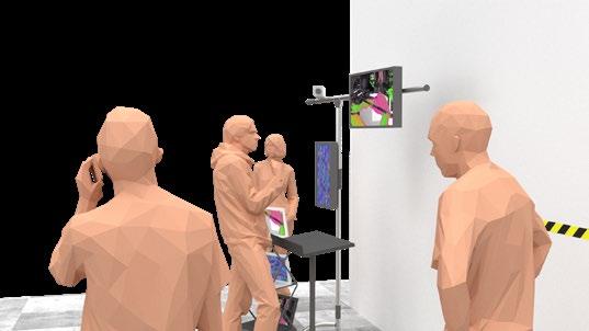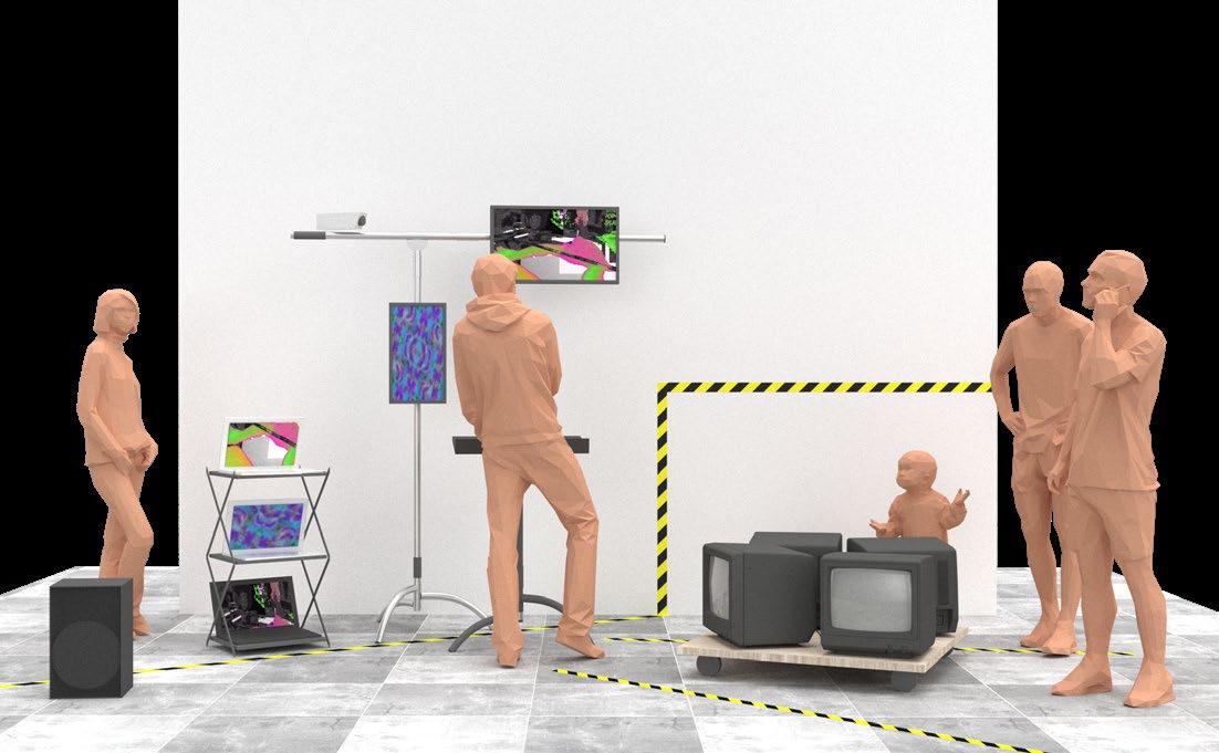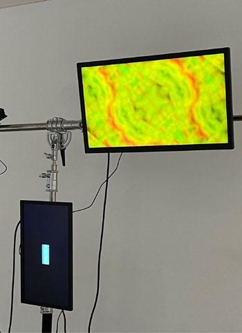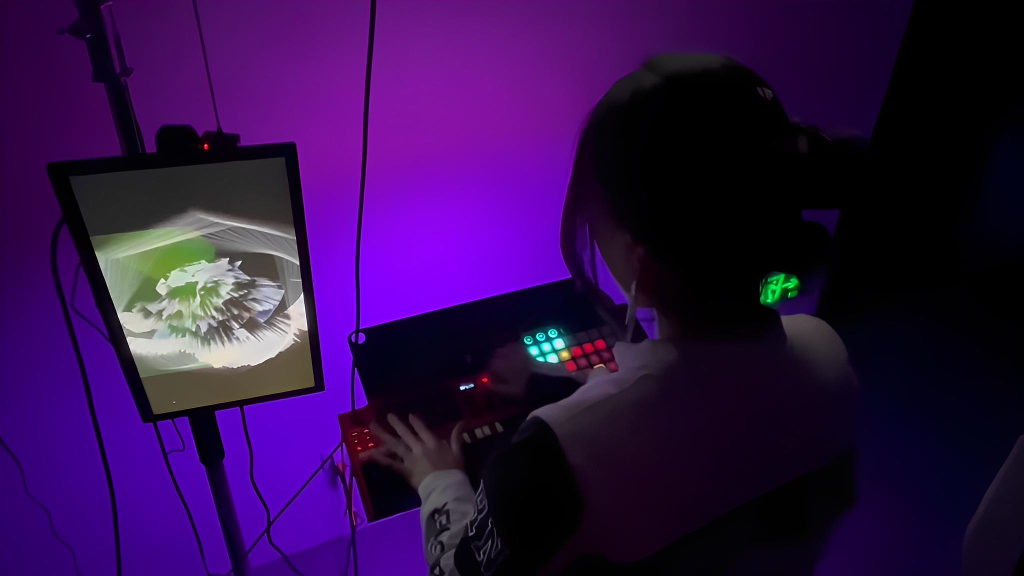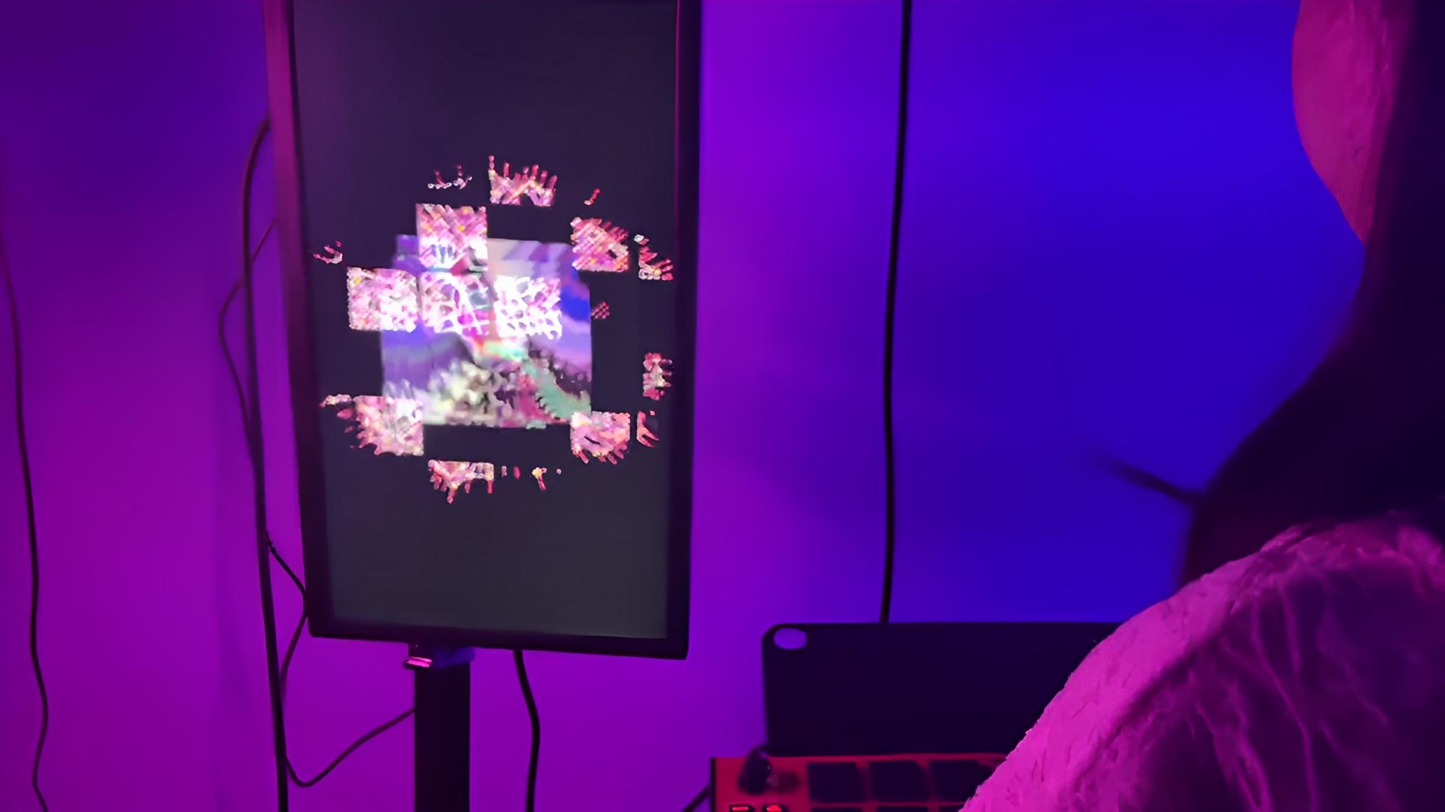 Processes real-time movements captured by the camera and sends images generated using Touch Designer to screen A The user's real-time performance is played through the stereo, and the music is visualized and output to screen B Visualize the user's behavior and sound, and play it on a loop through the screens to influence the surrounding onlookers