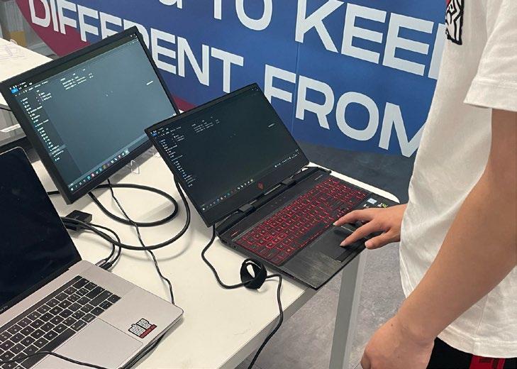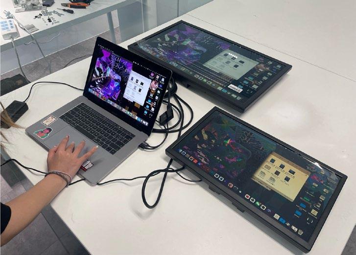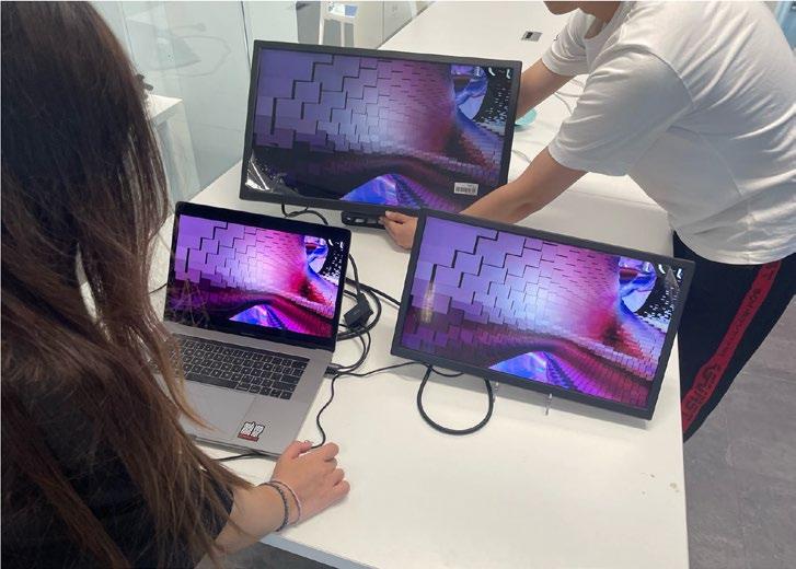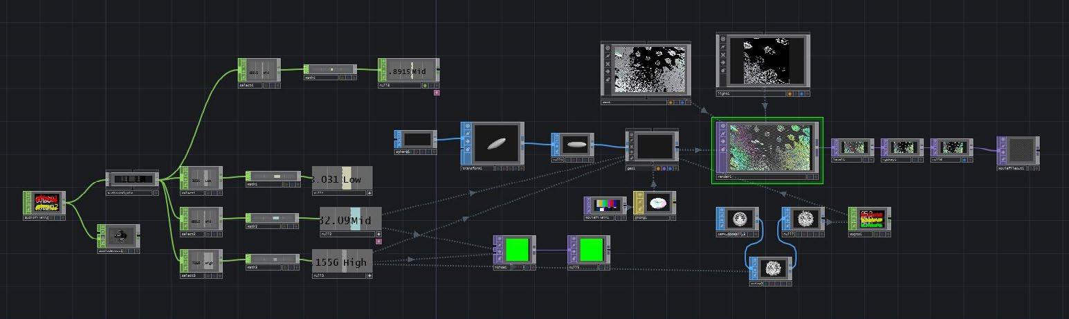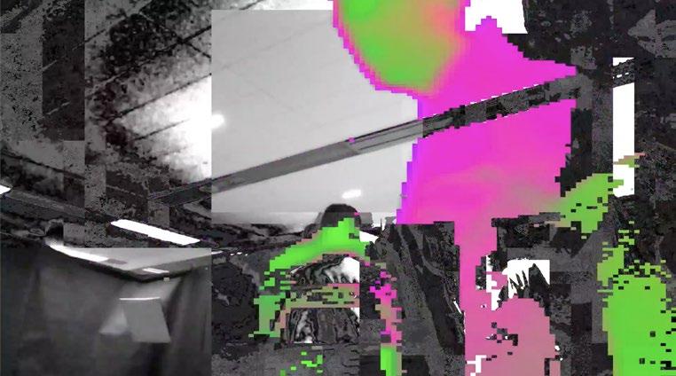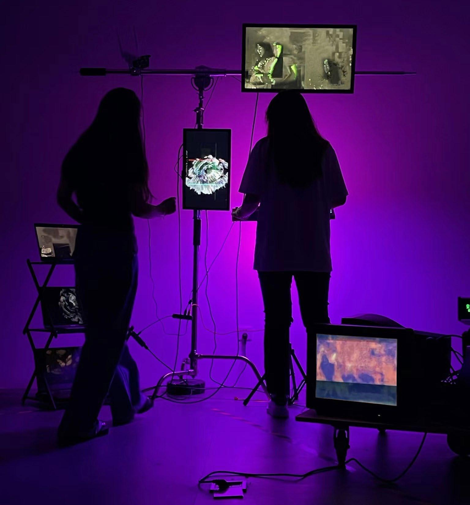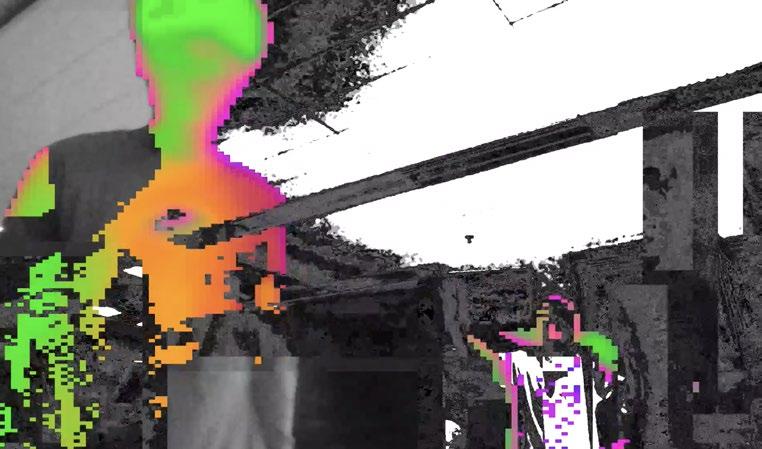 Processes real-time movements captured by the camera and sends images generated using Touch Designer to screen A The user's real-time performance is played through the stereo, and the music is visualized and output to screen B Visualize the user's behavior and sound, and play it on a loop through the screens to influence the surrounding onlookers