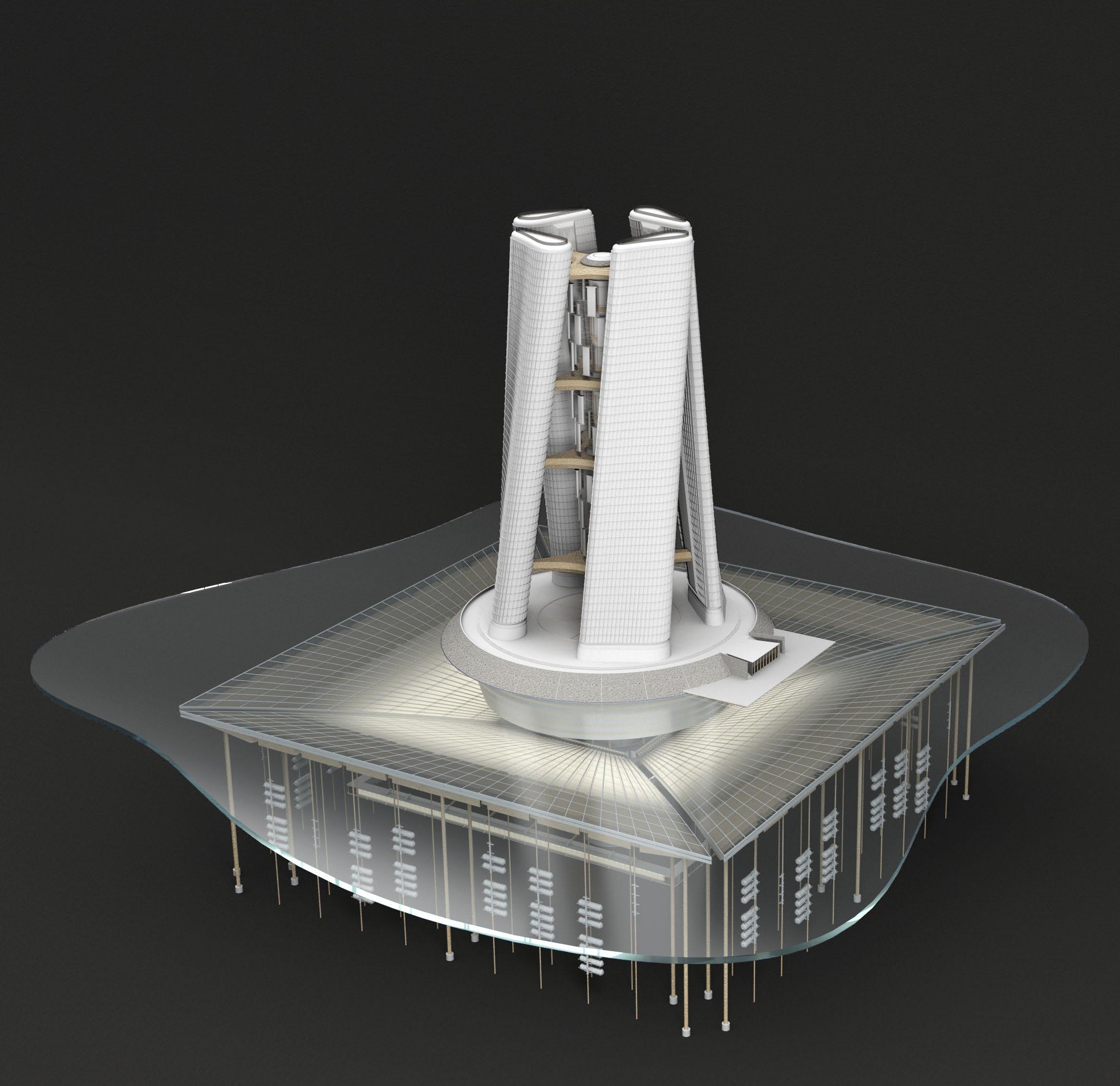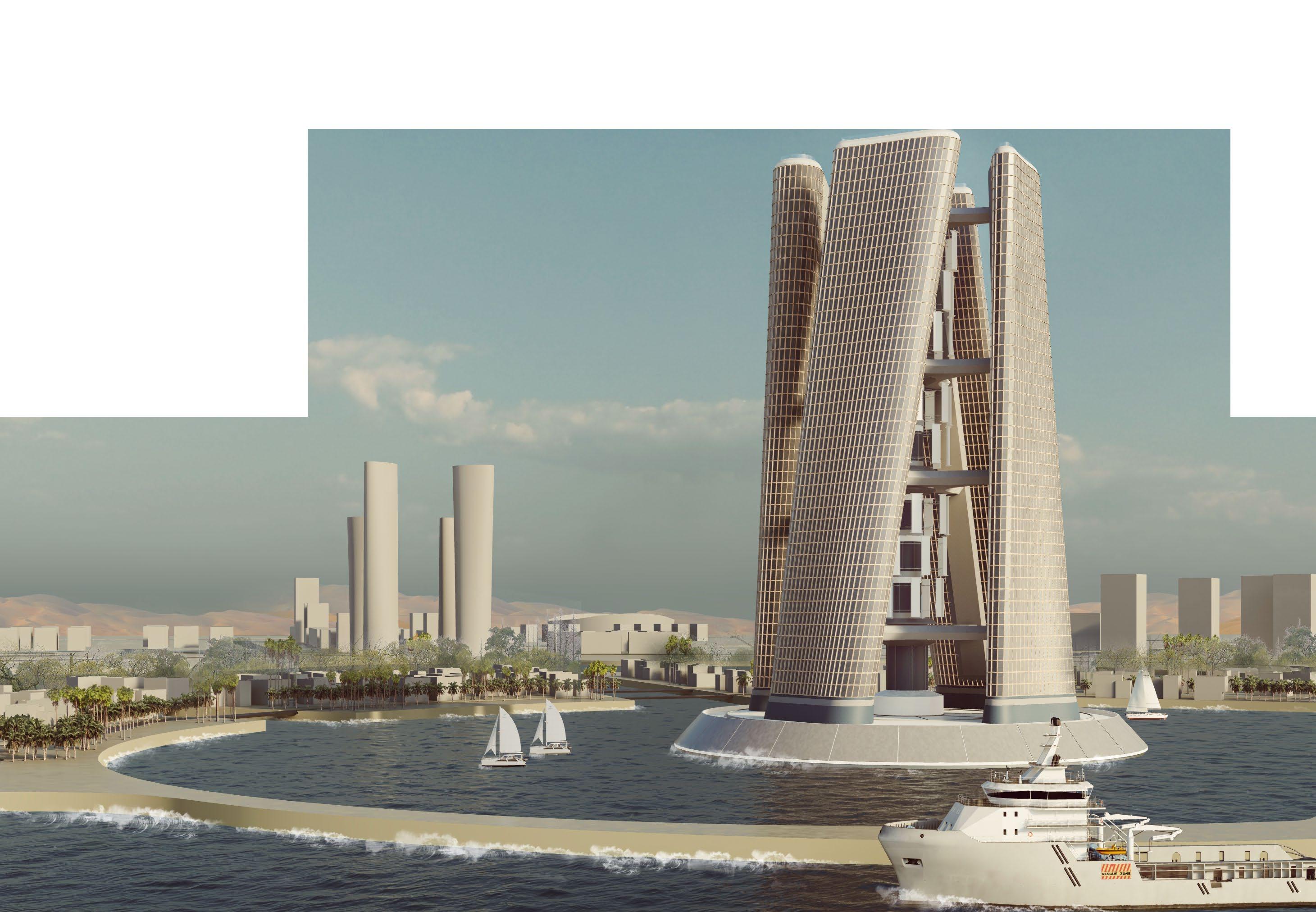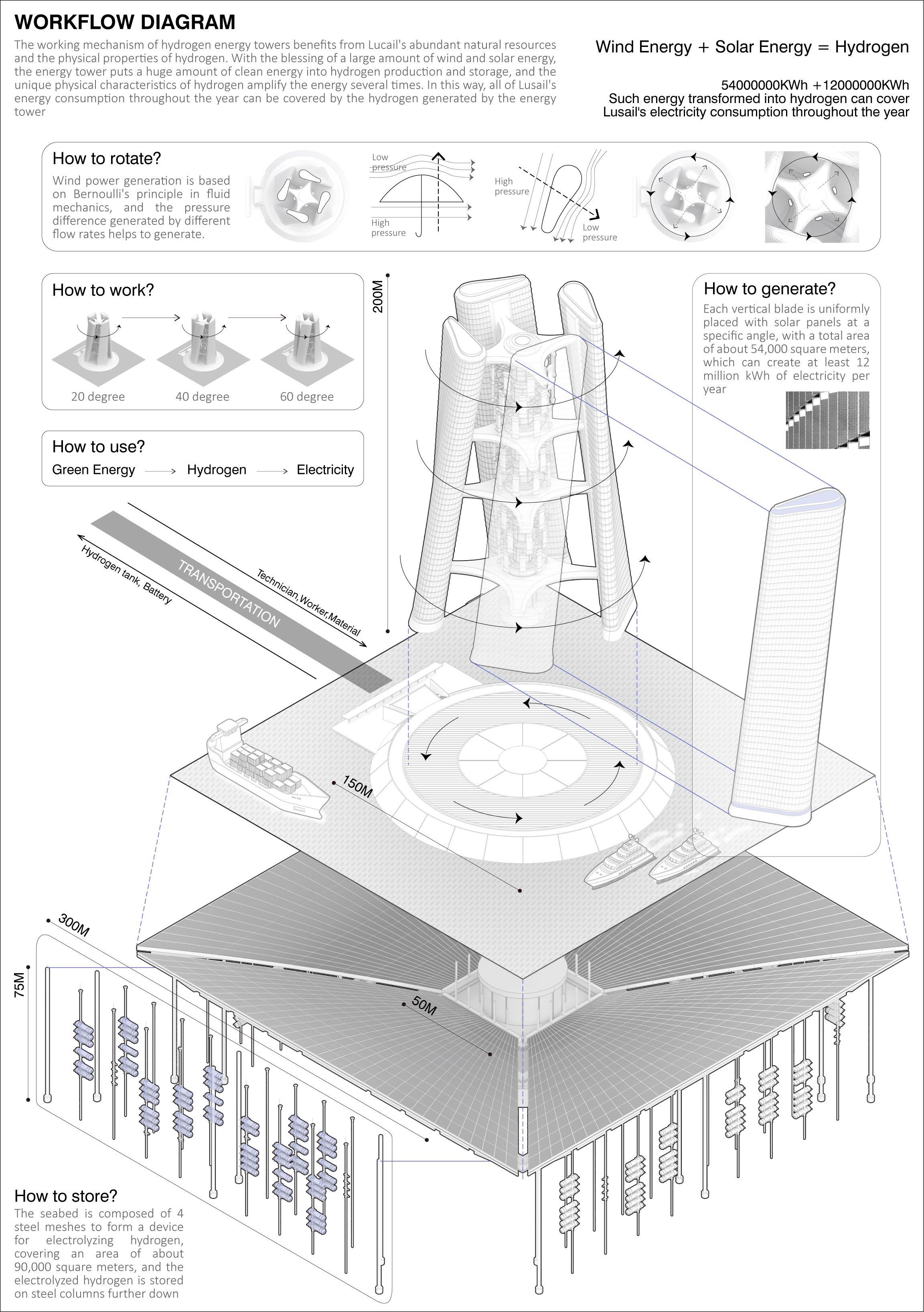 Inspired by Dubai's Squall Tower, decided to add 75% coverage solar panels to the giant vertical axis wind turbine, so that this hydrogen tower can maximize the conversion of the abundant wind and solar energy along the Qatari coast. Qatar's frequent winds and plenty of light provided some assurance for my design